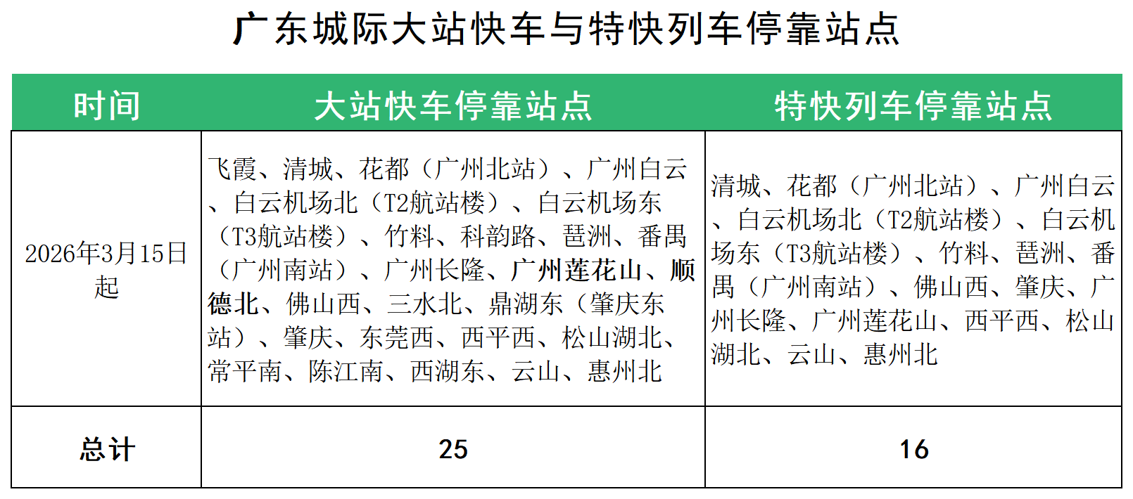调整后,全天将开行“飞霞-广州白云”“番禺-惠州北”“白云机场北-东莞西”“花都-肇庆”四条“站站停”交路,以及“广州白云-清城-飞霞”“肇庆-惠州北”“番禺-惠州北”“花都-东莞西”“广州白云-竹料”“白云机场北-佛山西”六条大站快车、特快列车交路。