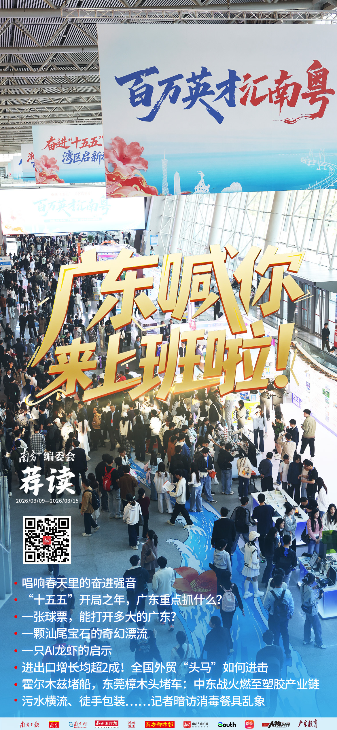 3月15日,“百万英才汇南粤”2026年春季大型招聘会在广州举办。来自五湖四海的青年学子背着行囊、手持简历,在入场通道前排起蜿蜒长龙,还有多所高校组团参加。本次报名招聘会的人数达15万人,创下历史新高。近2000家优质单位集中招聘,国家超级计算深圳中心、华润、比亚迪、腾讯、中兴通讯、优必选等科研机构、行业龙头企业悉数参与;总岗位数超8.5万个,其中人工智能和机器人领域百万年薪岗位达数百个,充分展现了广东新兴支柱产业蓬勃发展的势头。详情>>