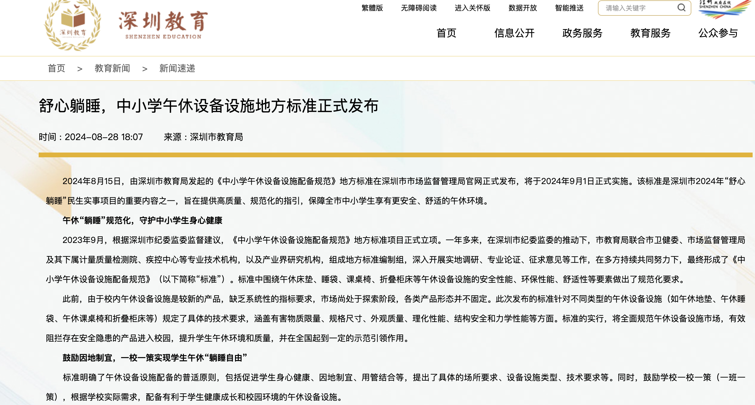 在国家标准出台前,深圳已深耕“舒心躺睡”多年。2024年9月1日,全国首个中小学午休设备地方标准——《中小学午休设备设施配备规范》正式实施,为国家层面标准制定提供了先行经验与实践样本。