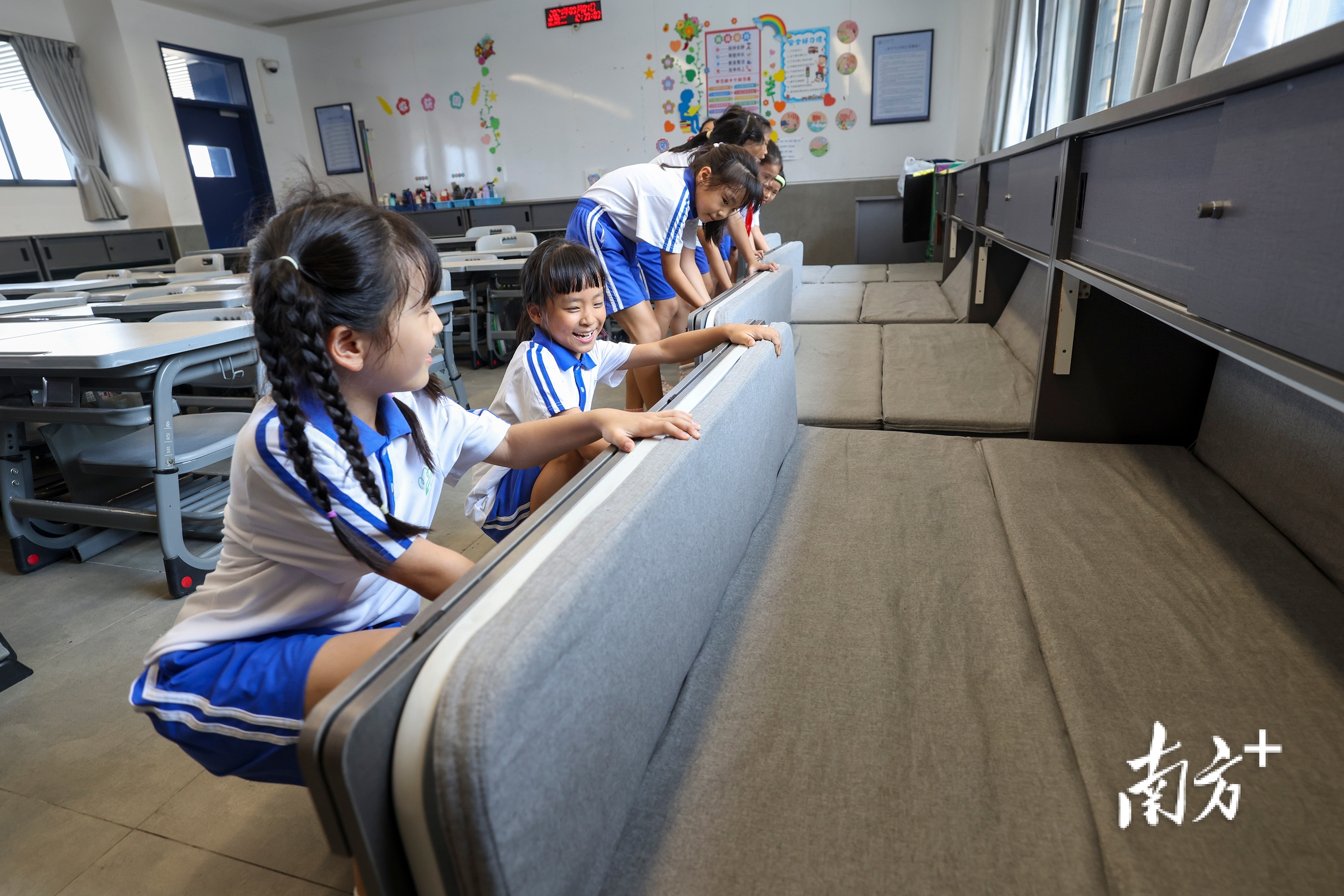 走进中山大学深圳附属学校教室,三面墙壁前都放置了长排储物柜,每天中午学生吃完午餐后,值日小组将座椅移到教室中间,随后学生齐刷刷地将隐藏在储物柜里的折叠床拉出来,铺好寝具,整个过程只要5分钟。