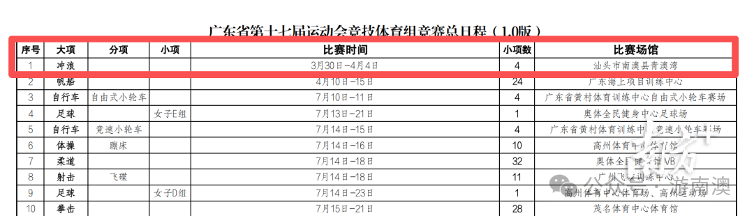 日前,广东省体育局正式公布广东省第十七届运动会(简称“第十七届省运会”)竞技体育组竞赛总日程(1.0 版)。冲浪比赛将成为本届省运会竞技体育的首个开赛项目。