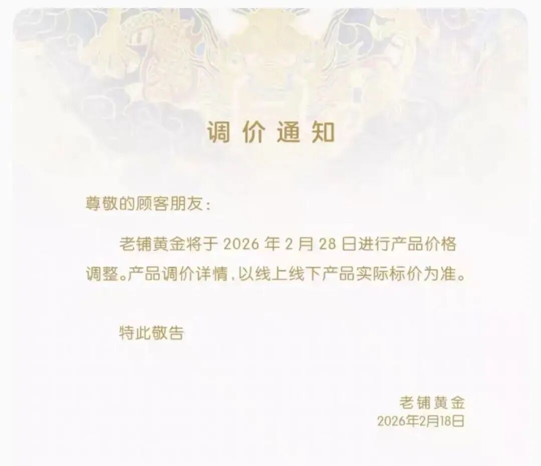 近日,老铺黄金开启了开年首轮调价,于2月28日进行产品价格调整,根据市场数据,此次调价幅度在20%至30%。此次调价是老铺黄金2026年的首次调价。2025年,老铺黄金在2月、8月、10月先后3次上调产品售价。