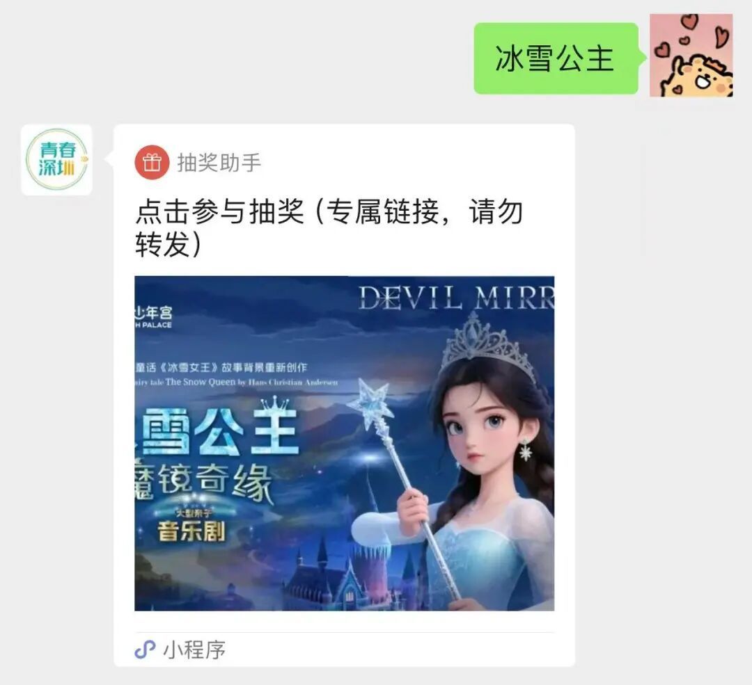 2.在“青春深圳”微信公众号对话框,回复关键词:“冰雪公主”即可参与抽奖活动。