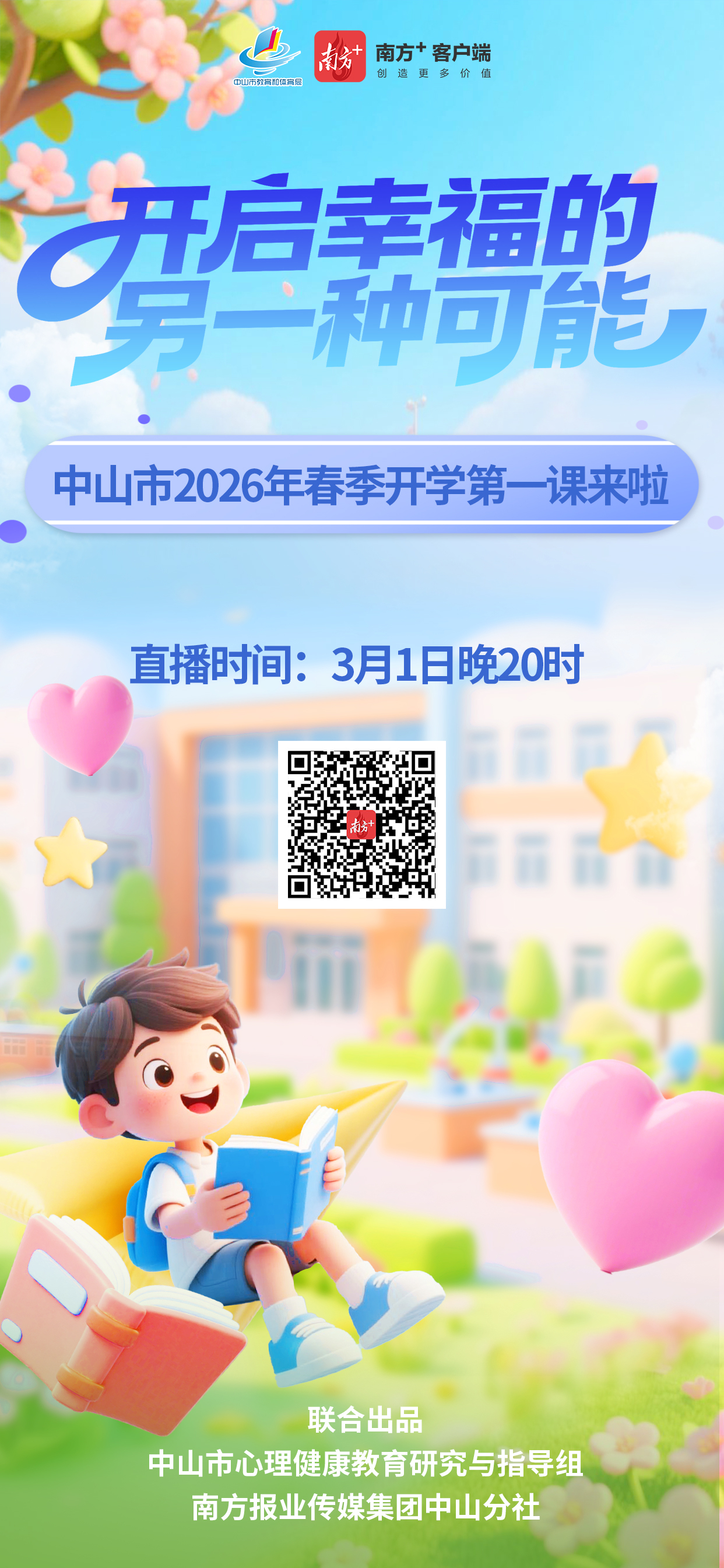 为了让同学们在经过欢乐的寒假生活后,能够迅速调整状态,以饱满的精力和积极的心态回归校园,中山市心理健康教育研究与指导组联合南方报业传媒集团中山分社,特推出心理健康春季开学第一课——《新学期,开启幸福的另一种可能》。