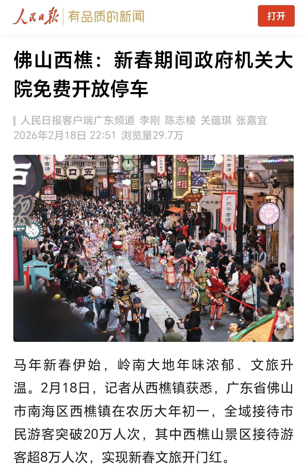 2月23日,笔者从西樵镇获悉,2026年春节假期,即2月16日-2月23日,“好玩西樵”以全域沸腾的文商旅盛宴,累计接待市民游客125.8万人次,同比增长23.2%,带动旅游消费超3.2亿元,迎来了丙午年的“开门红”。