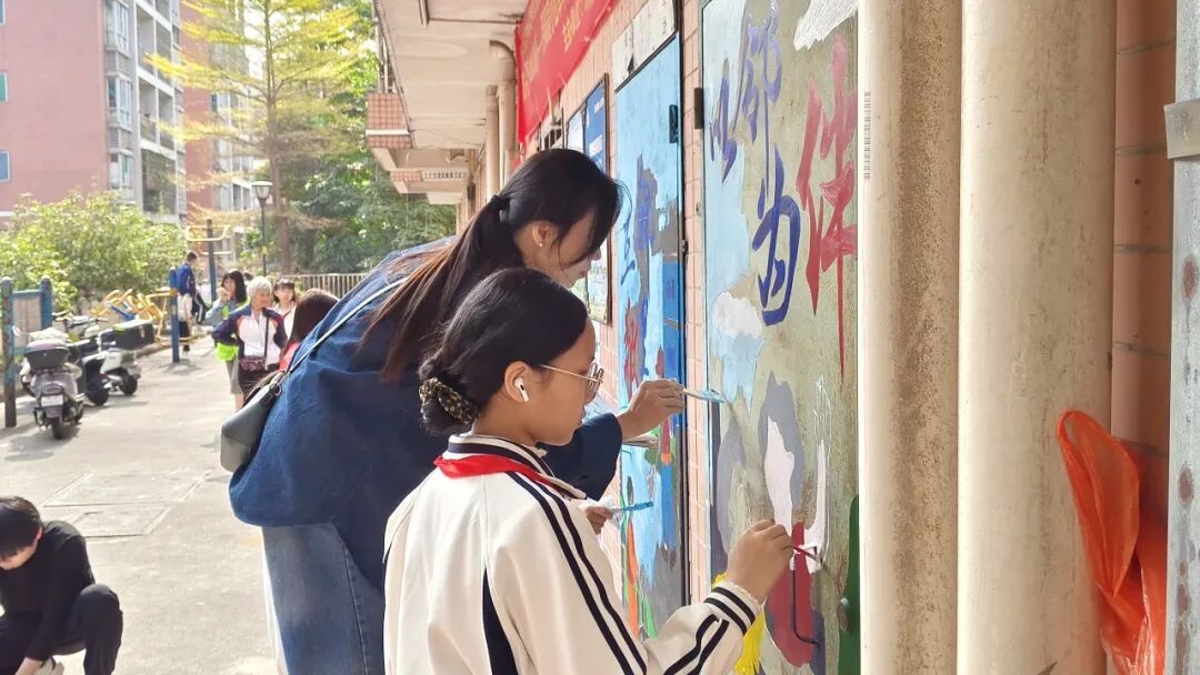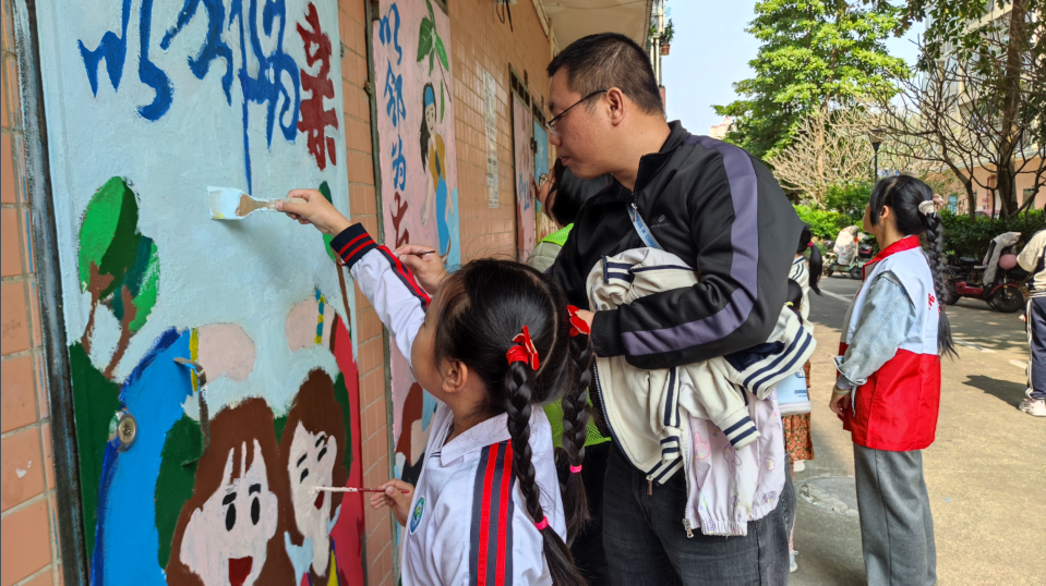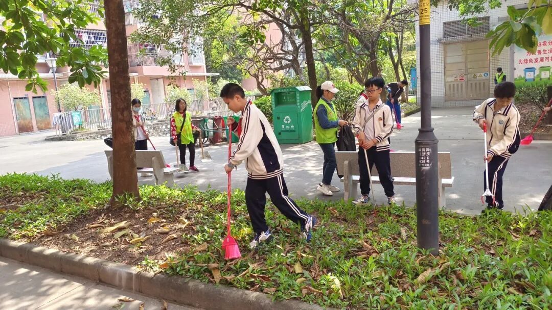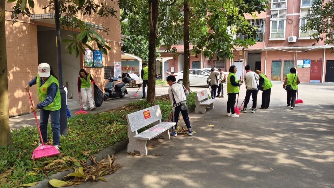 在彩绘创作如火如荼地开展的同时,另一支由学生和家长组成的小分队也随之到场,他们拿着垃圾夹、垃圾袋、扫帚等工具,在小区的人行道及绿化带旁忙碌着。学生们热情高涨,干劲十足,仔细搜寻着路面、草丛中的烟头、纸屑、塑料袋等废弃物,不放过任何一个卫生死角。家长们也以身作则,一边引导孩子如何正确清扫,一边向居民普及爱国卫生、垃圾分类、消防安全等知识,引领大家共同维护整洁、安全、有序的居住环境,主动参与小区共治。
