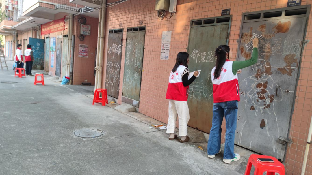 经过两个多小时的精心描绘,一排色彩鲜艳、主题鲜明的涂鸦作品跃然于“门”上。原本斑驳锈迹、暗淡无光的门扉瞬间变得生动活泼起来,“以邻为善,以邻为伴”主题墙绘成为小区里一道独特的风景线,引得过往居民纷纷驻足欣赏,赞叹不已。