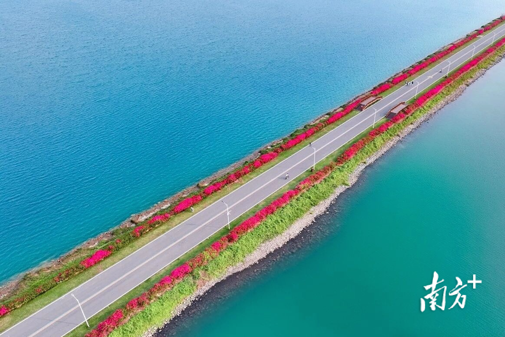 晨光微熹,茂名露天矿生态公园的环湖步道上,碧水微澜,静待足音。