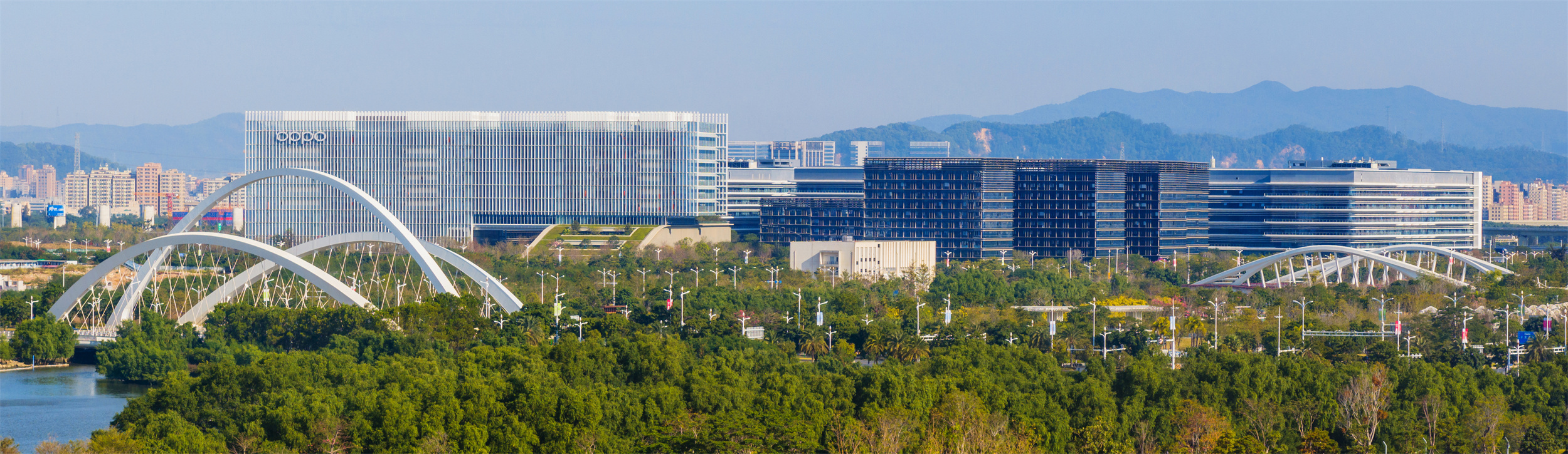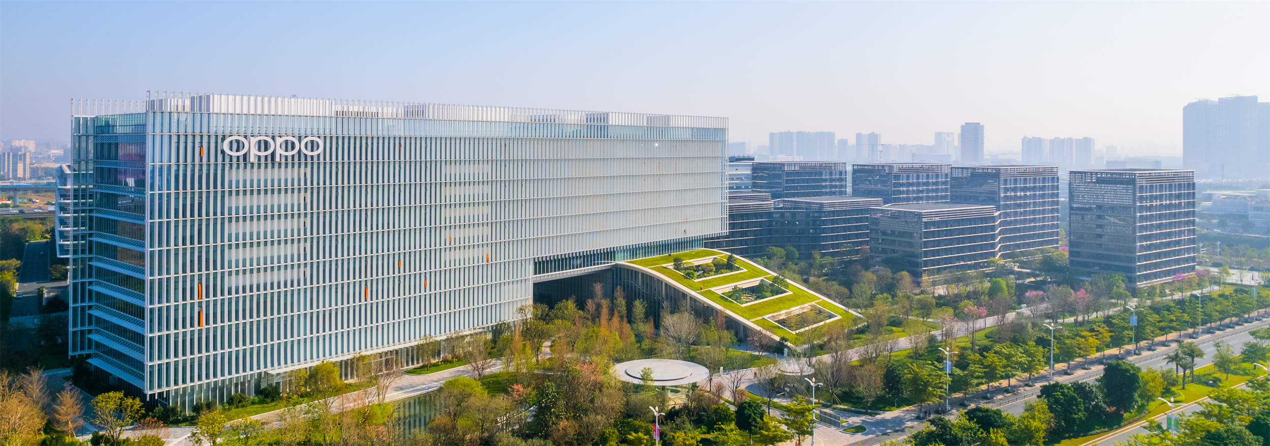 望向滨海湾OPPO园区,现代建筑群巍然伫立。