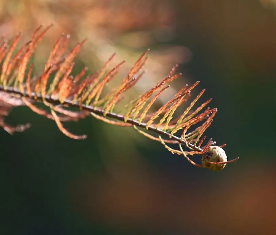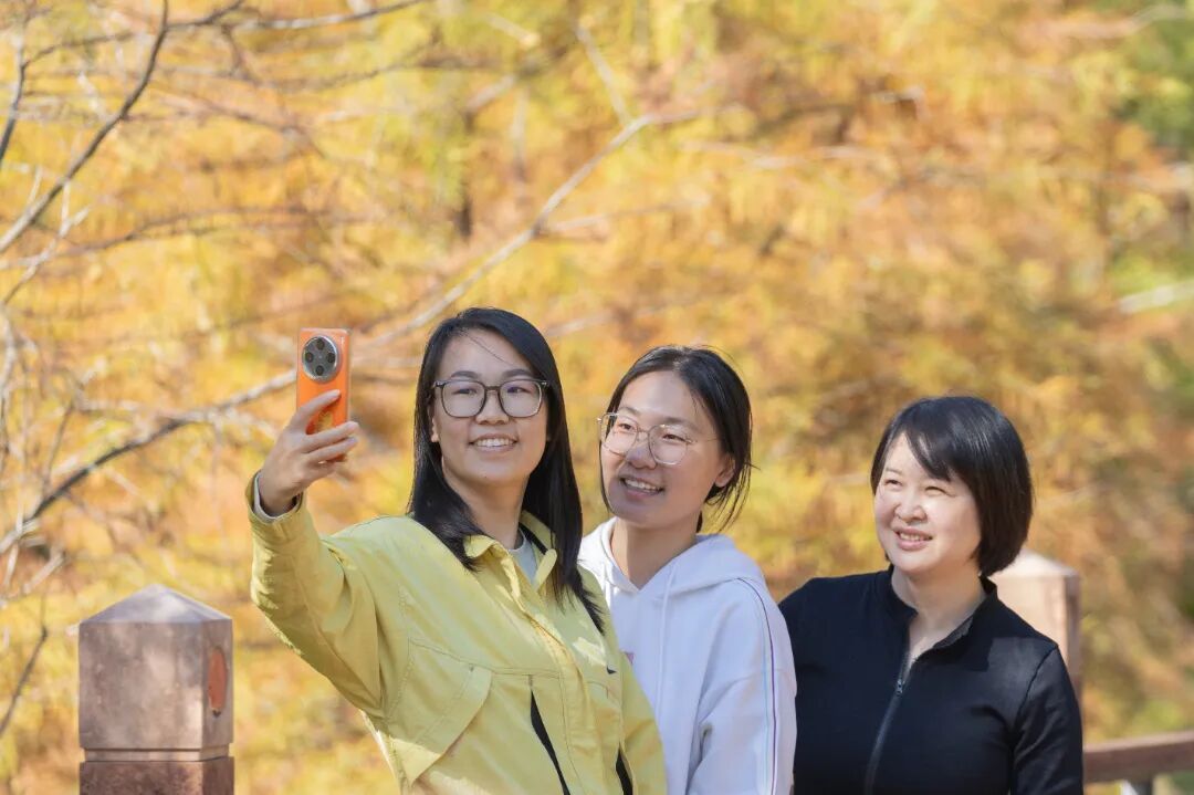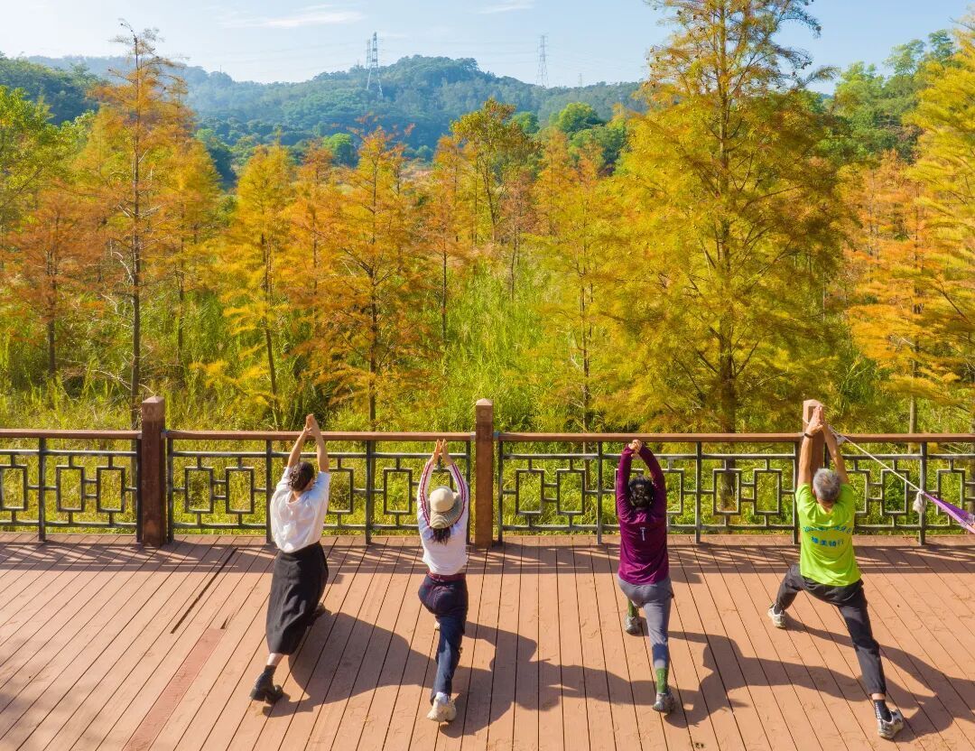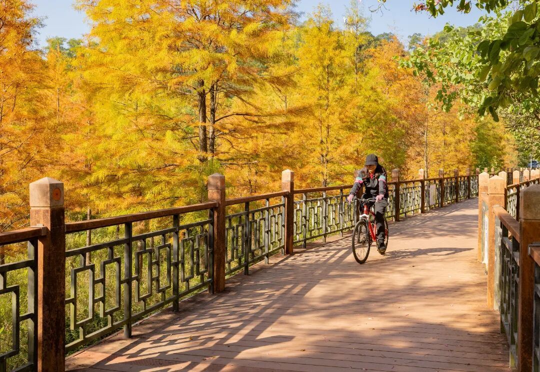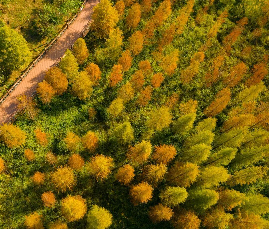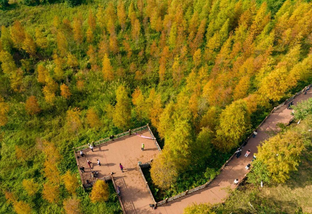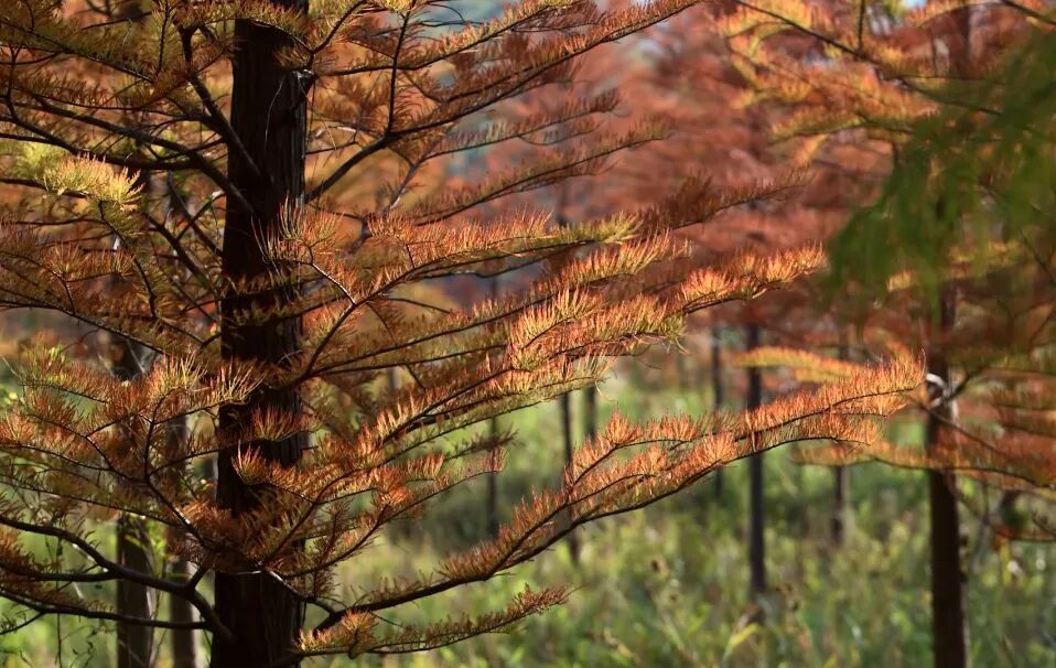 在大岭山森林公园观湖广场的木栈道旁,成片的落羽杉林褪去深绿,换上了一身暖色调的“新衣”。