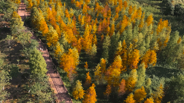 现在正是虎门落羽杉一年中最绚烂的时节。从树梢开始,落羽杉金黄与橙红交织,在晴空下勾勒出一条错落有致、明丽如画的光彩林带。