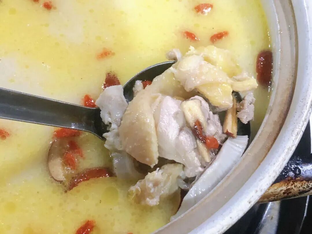 清汤水里炖着红枣、党参和天麻等中药材(严格来说更像是是一煲药材汤),还是广东在家打边炉中常见的锅底。