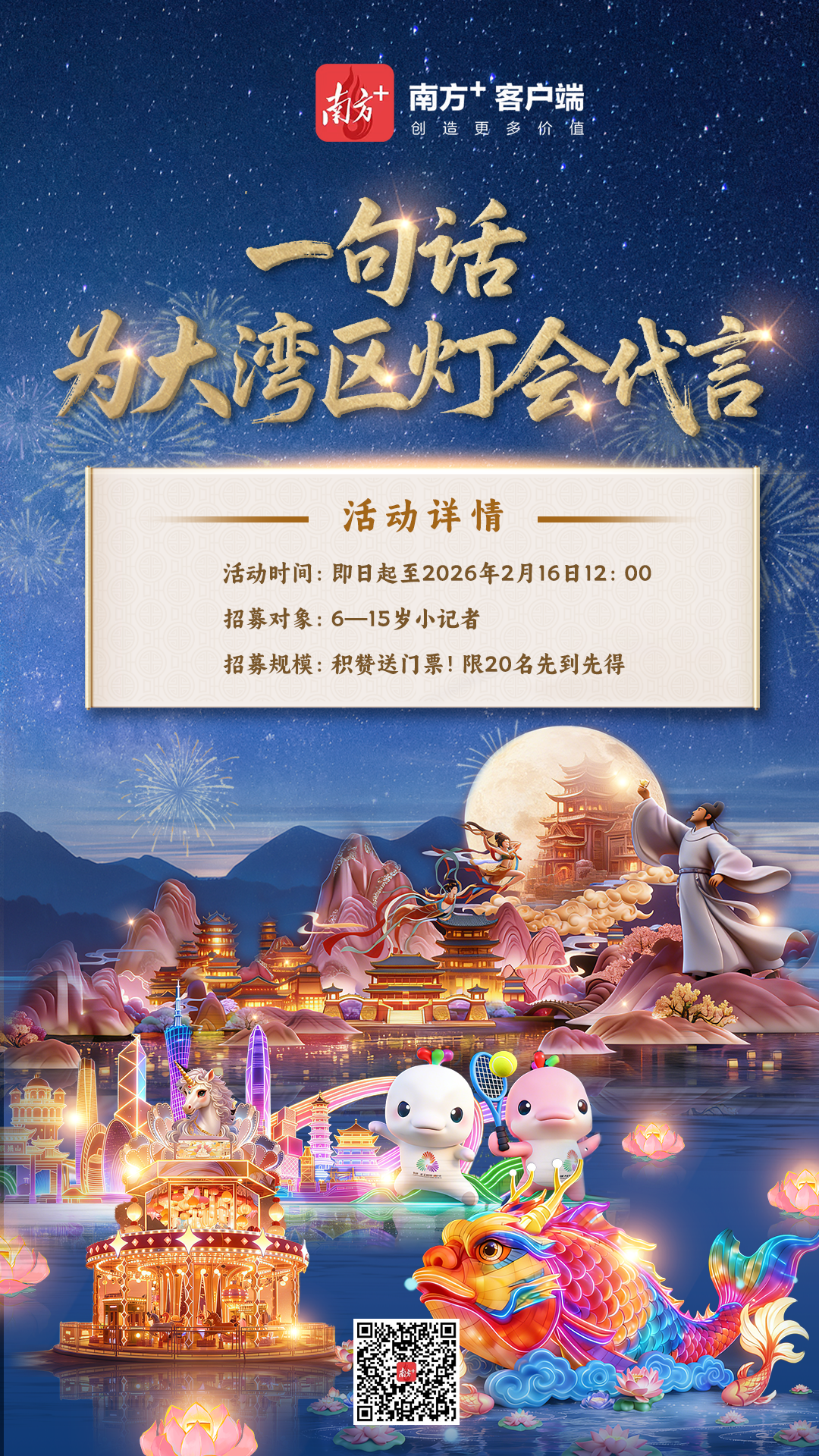 即日起至2026年2月16日,南方+客户端、南方报业传媒集团广州分社联合粤港澳大湾区灯会组委会,面向广大青少年,以南方报业小记者的身份,用一句话向海内外推介大湾区灯会品牌和南沙城市形象。