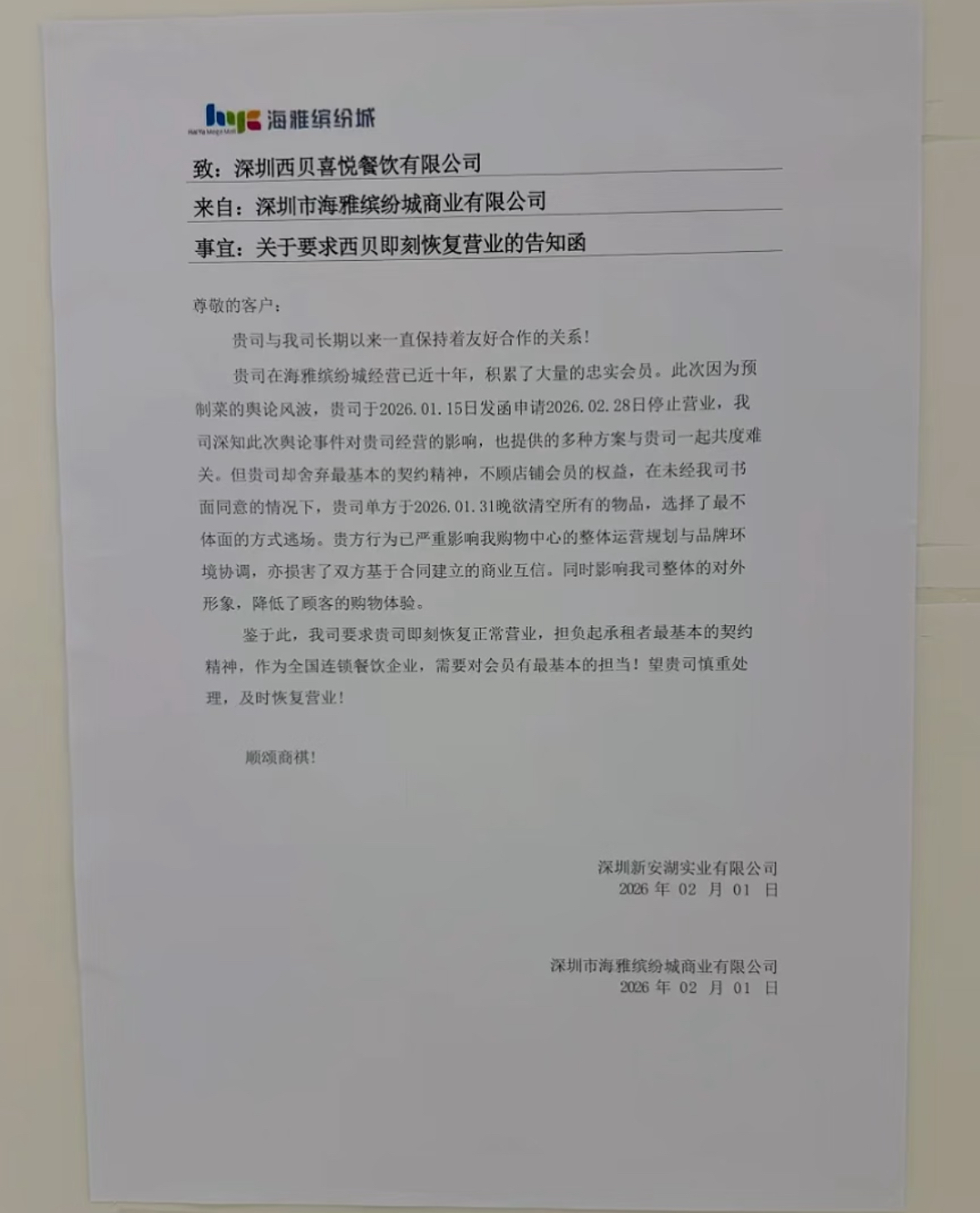 近日,一份“深圳海雅缤纷城要求西贝即刻恢复营业”的告知函,在网络上引发关注。告知函称西贝“不顾店铺会员权益”“选择了最不体面的方式逃场”。