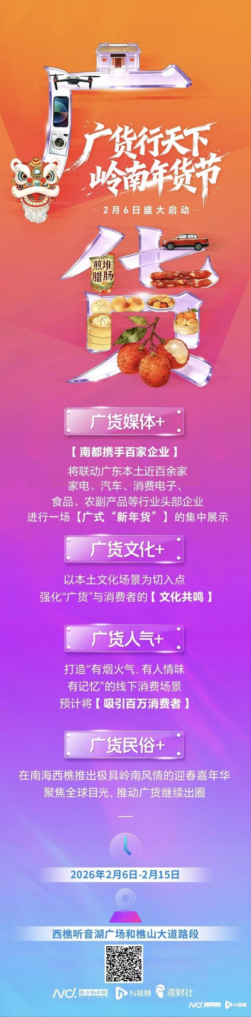 线下方面,2月6日,由南方都市报等单位联合主办的2026广货行天下·岭南年货节”,将在风景秀丽的佛山西樵听音湖广场拉开帷幕。活动为期十天,持续至2月15日。本次年货节是“广货行天下”系列活动中独具特色的一站,是集合了品牌展销、文化体验与湖光游览的全景式广货嘉年华。