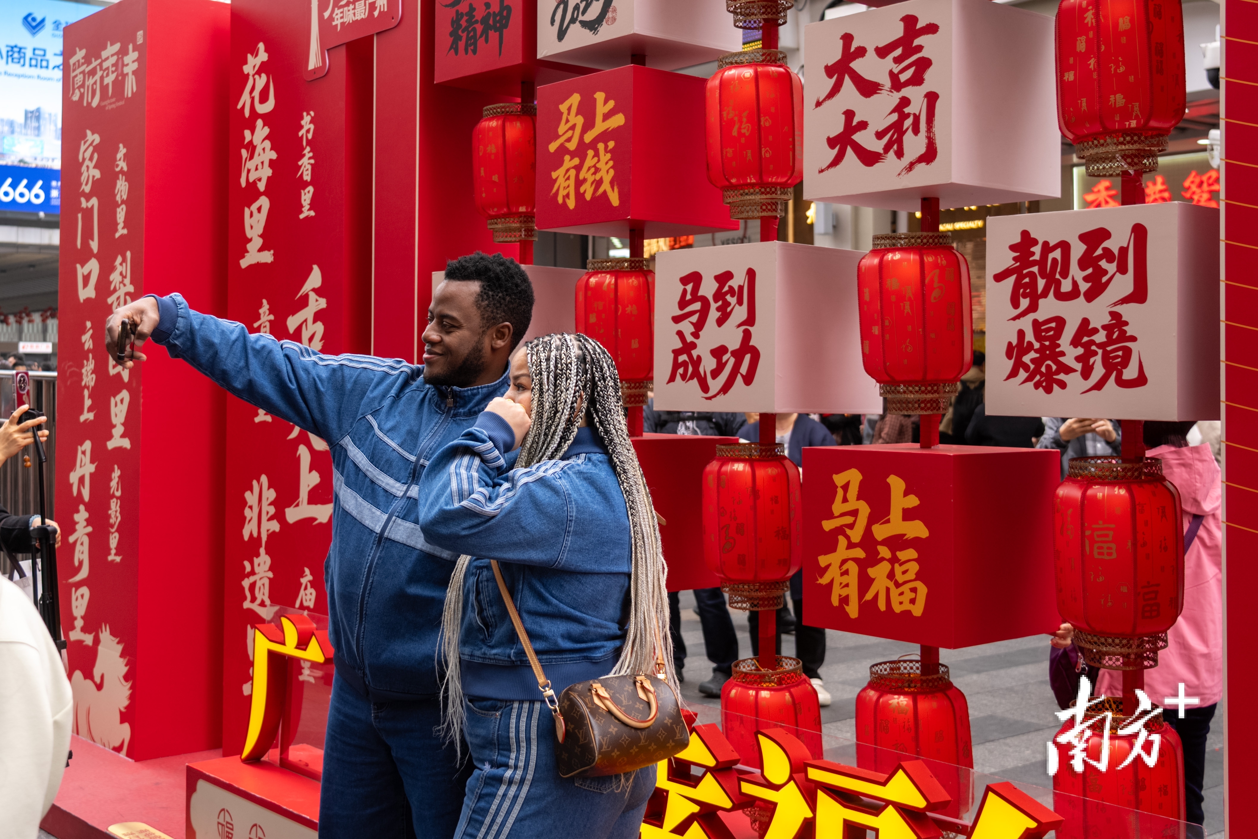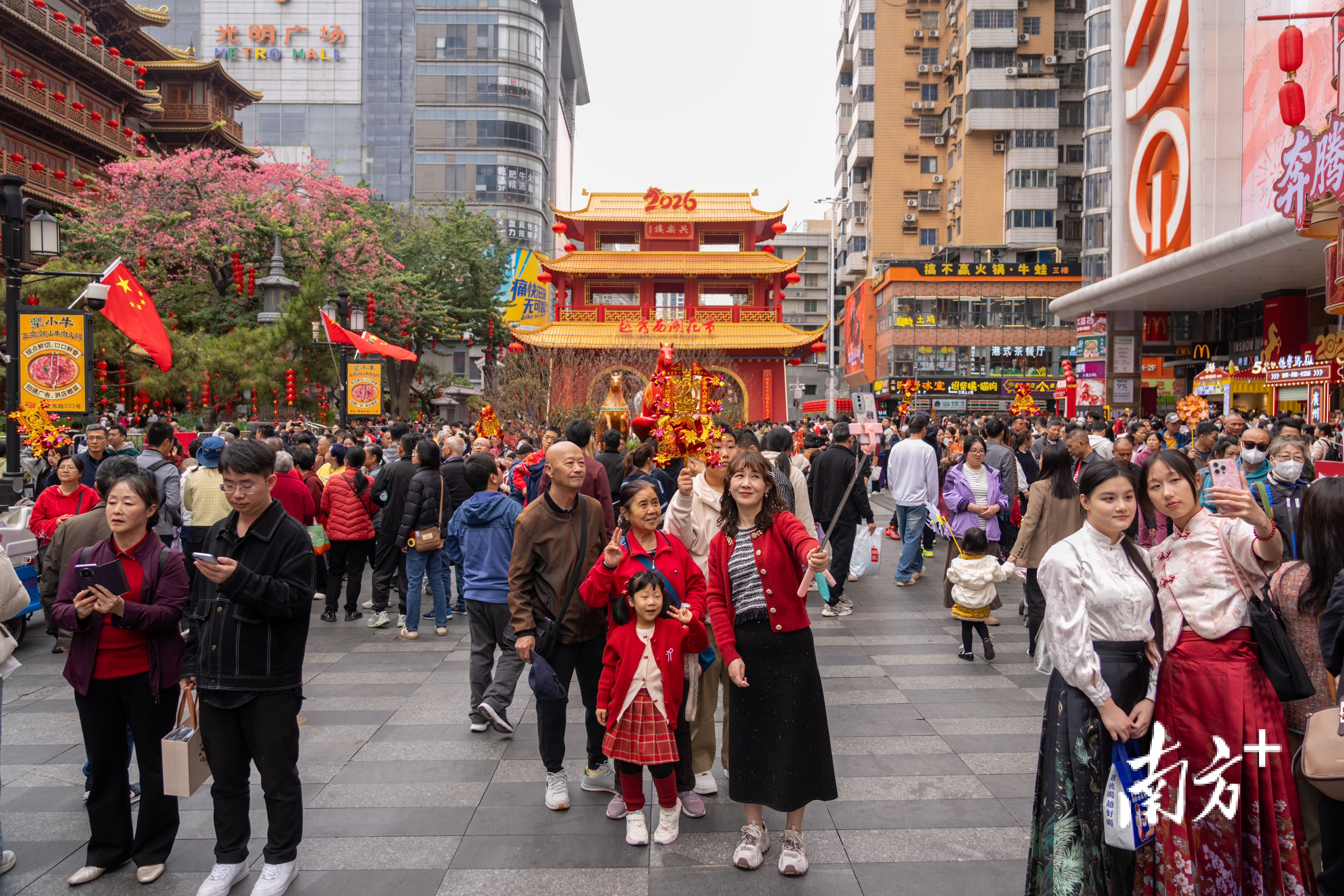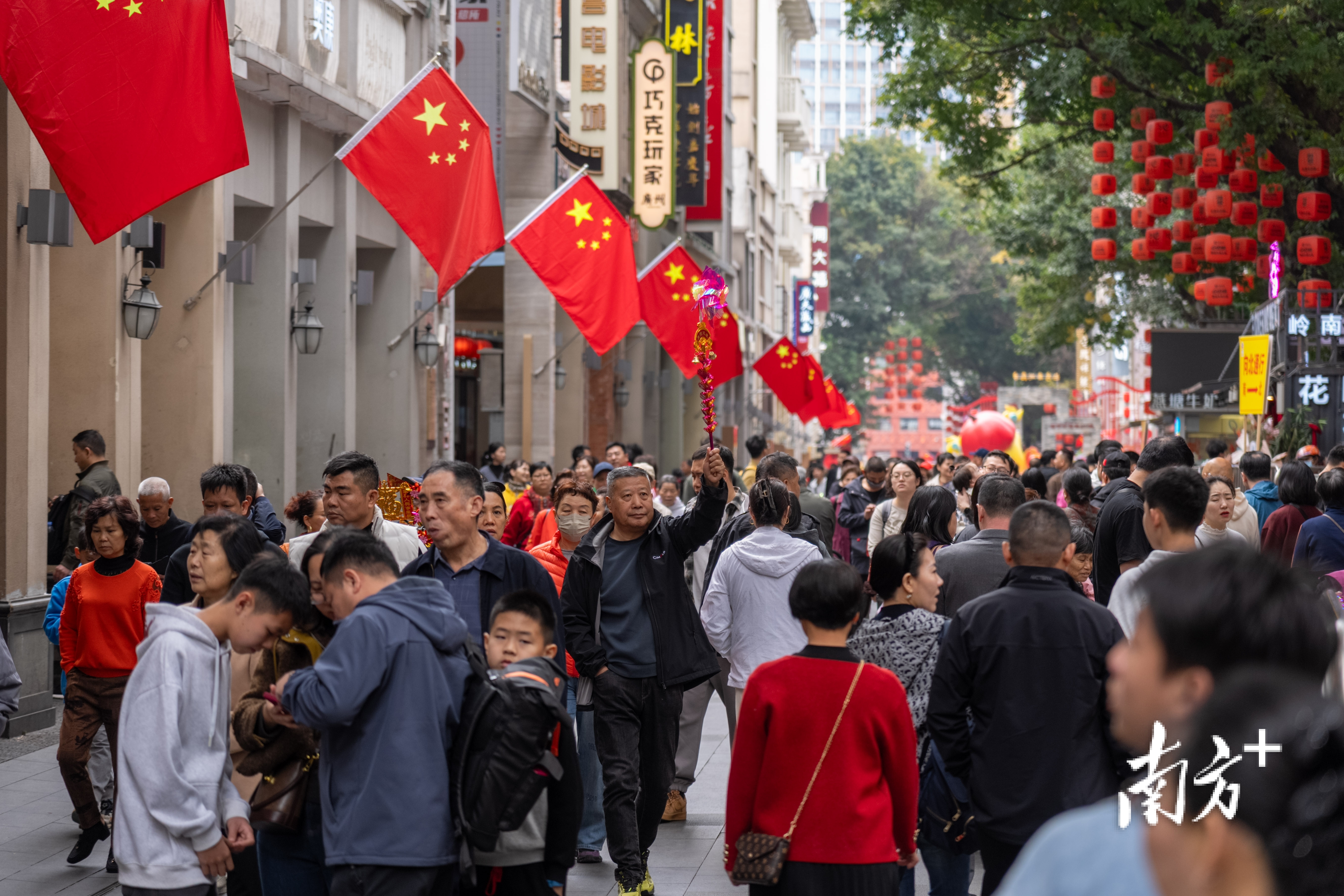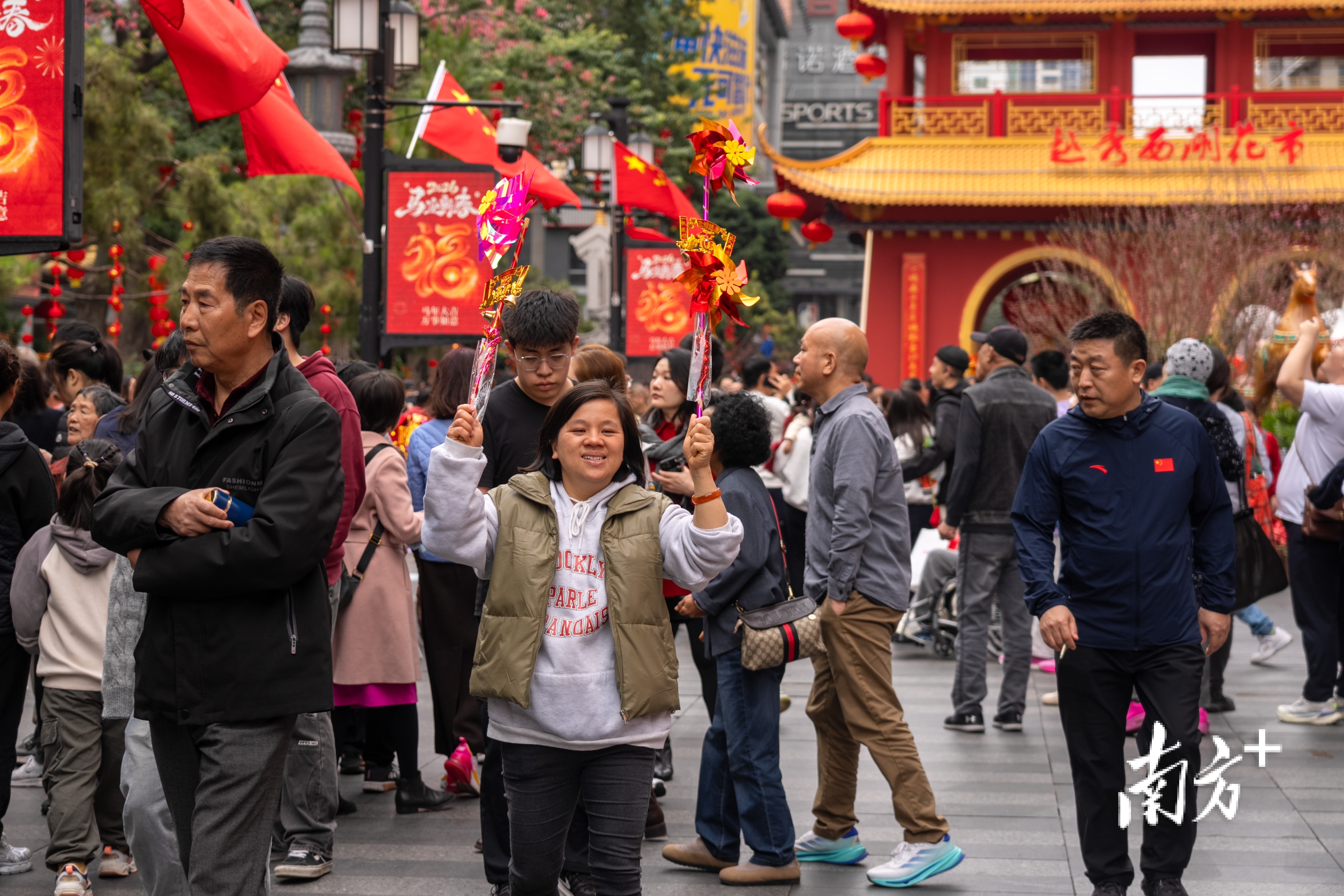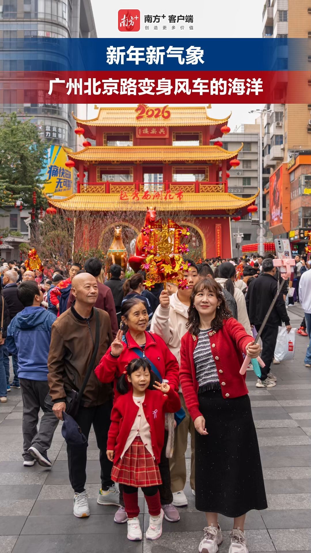 2月17日农历正月初一早上,广州北京路步行街人头攒动,大量市民和游客穿着新衣,手持风车走上街头,祈求新一年“行大运”。