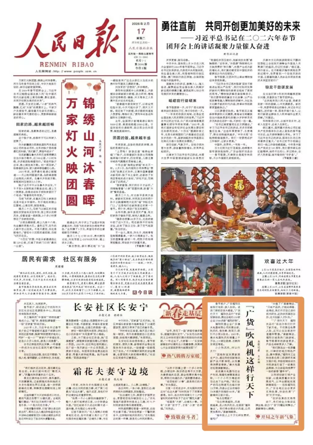 2月17日是正月初一,《人民日报》头版刊登《“广货”吹风机这样行天下(新春走基层·开局之年新气象)》,报道了揭阳古城“广货行天下 揭阳优品行”活动,展出的“揭阳好物”康夫吹风机。这正是揭阳在好政策支持带动下,因地制宜发展新质生产力,全力推动品牌出海,助力“广货”闪耀全球舞台的生动实践。