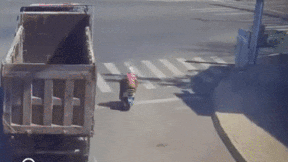 ▲学生骑行电动自行车转弯时,进入大货车盲区,被大货车从头部碾压而过