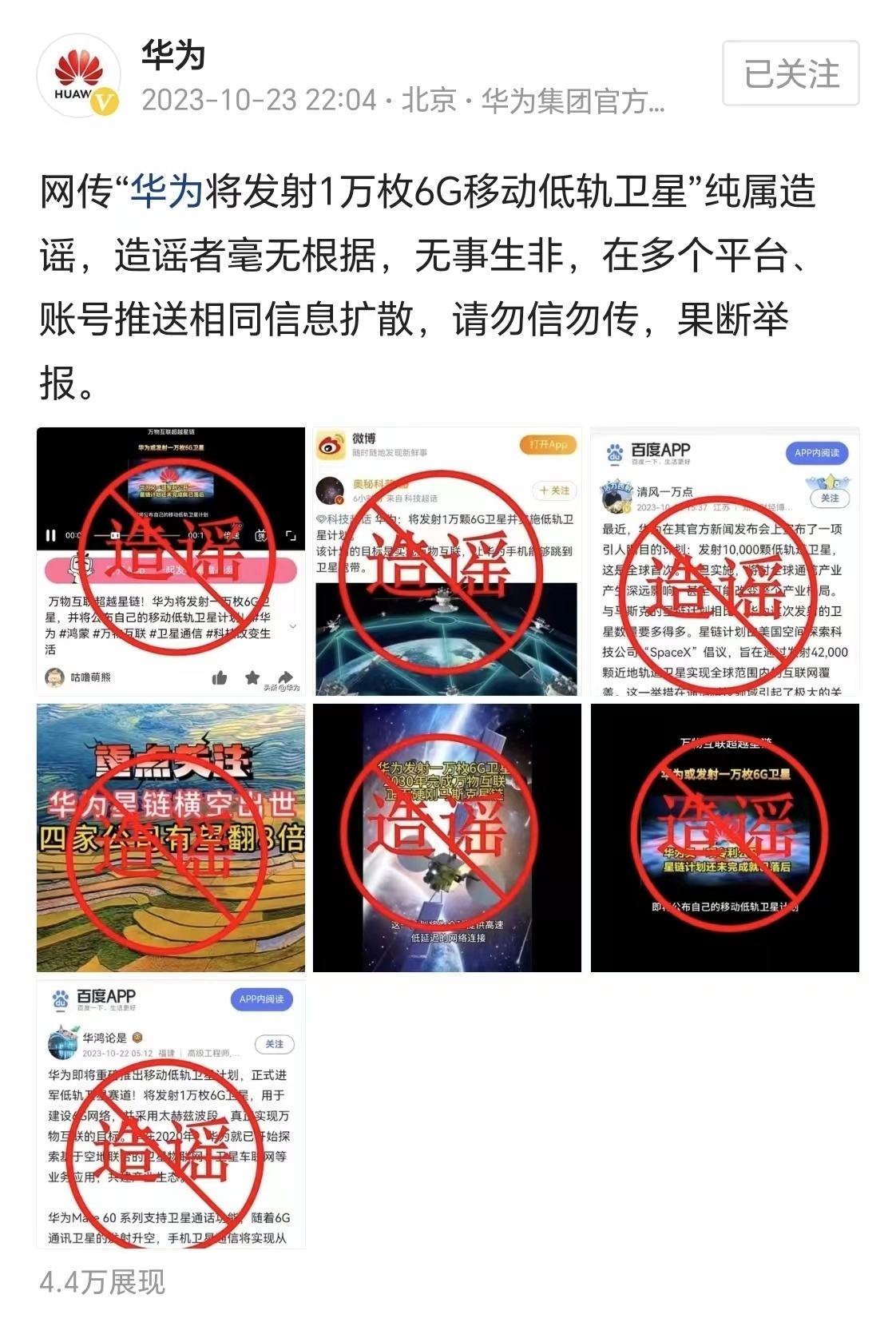 近日,多个社交平台出现“华为将发射1万枚6G移动低轨卫星”的消息。10月23日晚,华为通过官方账号辟谣,称网传“华为将发射1万枚6G移动低轨卫星”纯属造谣,造谣者毫无根据,无事生非,在多个平台、账号推送相同信息扩散,请勿信勿传,果断举报。详情>>