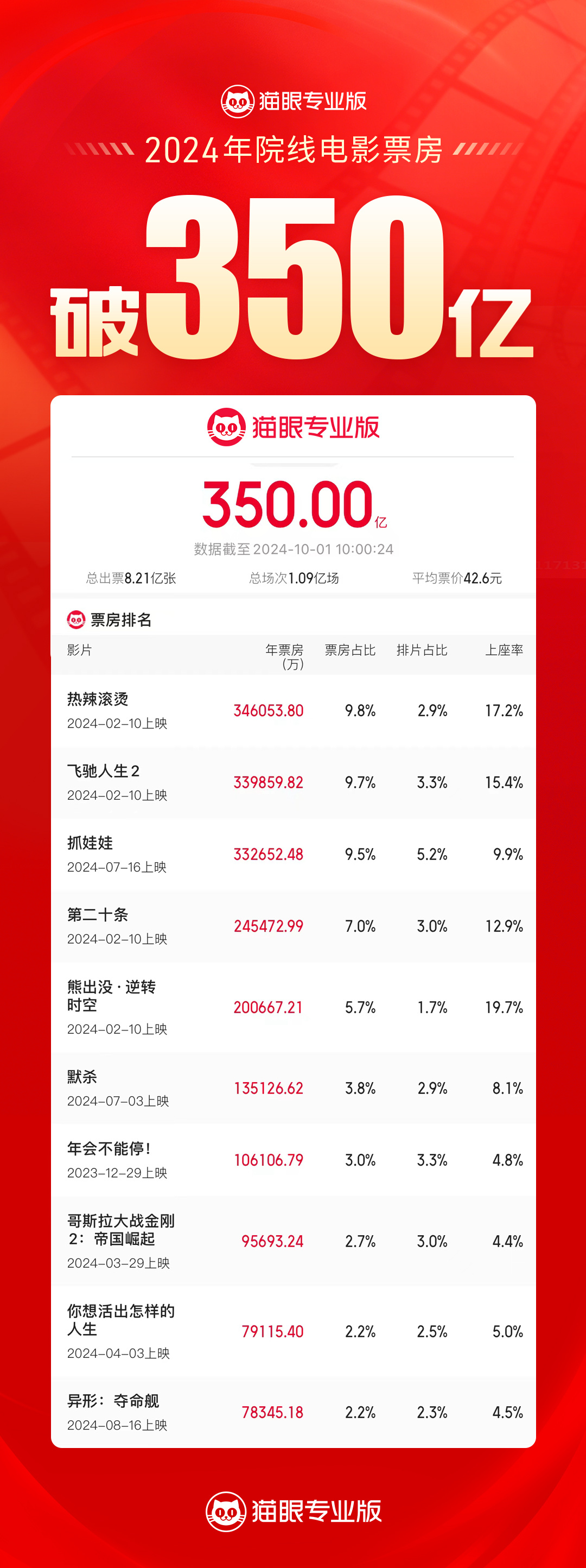 据猫眼专业版数据,2024年10月1日10时,2024年度全国电影票房(含预售)突破350亿元,总人次8.21亿,总场次1.09亿。