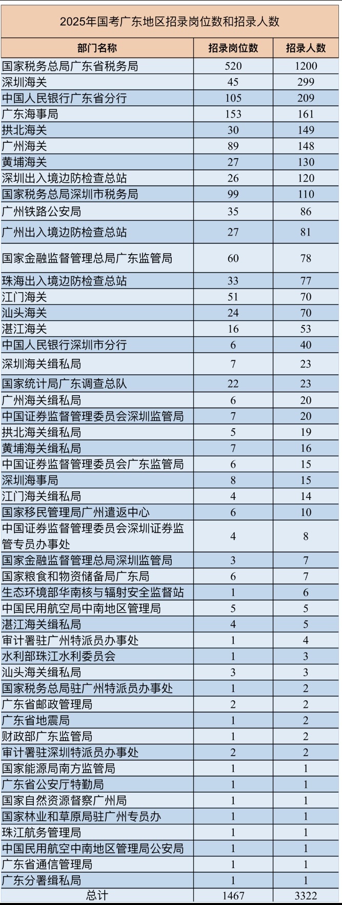 据统计,广东地区有1467个岗位参加招考,招录人数为3322人。其中,国家税务总局广东省税务局招录岗位和人数最多,分别为520个、1200人。