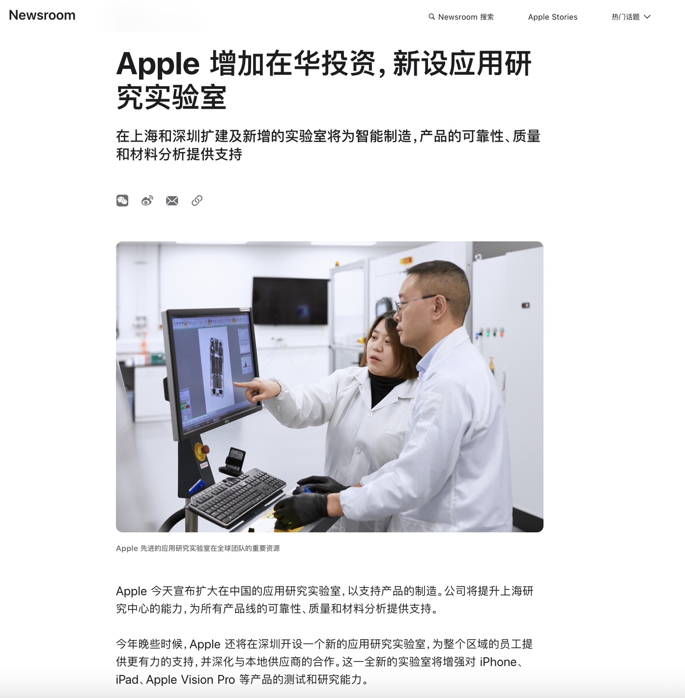 3月12日,苹果公司在官网宣布增加在华投资,扩大在中国的应用研究实验室,以支持产品的制造。公告透露,今年苹果公司将在深圳开设新的应用研究实验室,这一全新的实验室将增强对iPhone、iPad、Apple Vision Pro等产品的测试和研究能力。