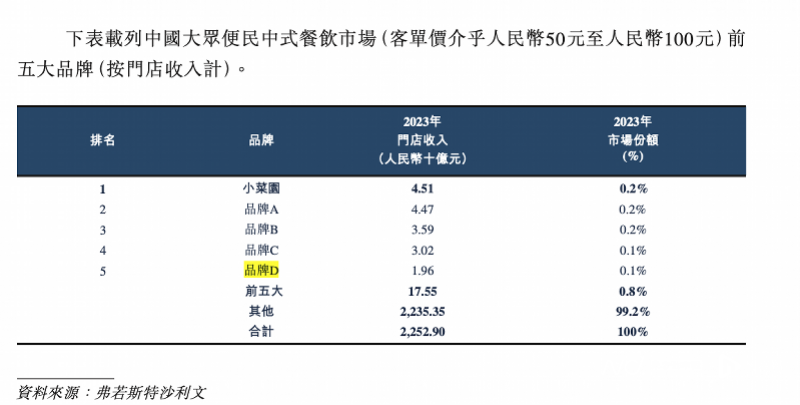但是,绿茶扮演了后来者居上的角色,如今其门店数和收入均已经将外婆家甩在了后头。根据小菜园最新递交的招股书,在客单价介于50元到100元的大众便民中式餐饮市场里,2023年,外婆家的门店收入为19.6亿元,市场份额为0.1%,排在第五名,而绿茶则排在第三位,其去年门店收入为35.9亿元,市场份额为0.2%,小菜园排名第一,收入为45.1亿元,市场份额为0.2%。
