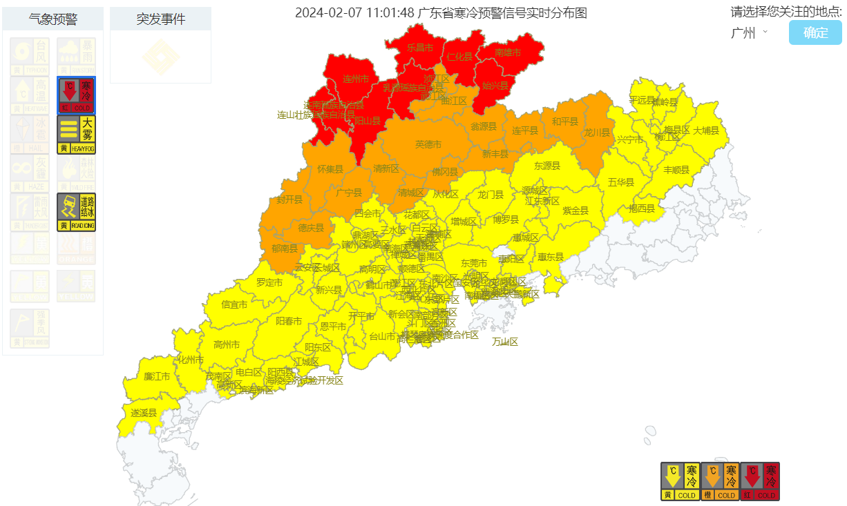 随着冷空气进入广东,全省各地开始出现明显降温,粤北北部已启动10个最高级别的寒冷红色预警。
