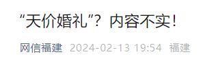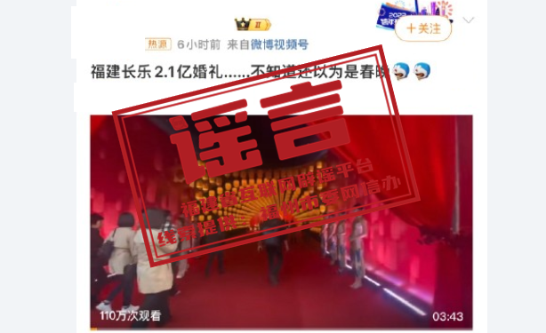 据属地核查,网传“长乐天价婚礼”的新郎本人及其父母均为香港籍,婚礼在自家企业厂房内举办,网上传播情况严重失实;网传“莆田叶府婚宴”中,新郎家里从事黄金珠宝行业,并非老凤祥董事长儿子,相关内容严重不实。而“2.1亿”实为2013年旧闻信息,网上相关账号以“2.1亿”婚礼标签来博眼球、赚流量、蹭炒热点,扰乱网络传播秩序。
