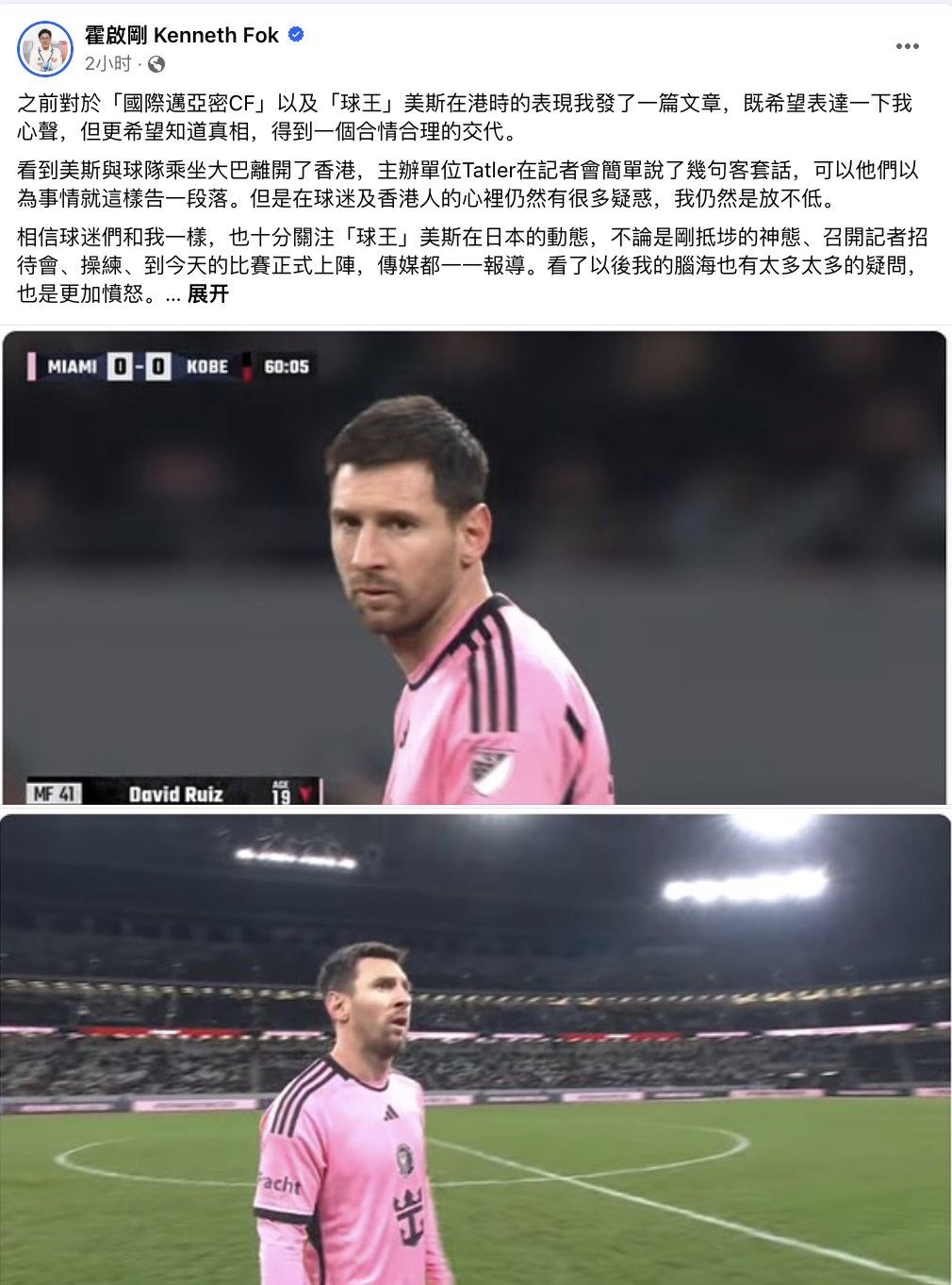 刚刚看到梅西正式上场,再回想到我们香港4万名观众在大球场的失落场面,以及梅西全程面无表情、回避合照的场景,真的十分难受。在此我重申:希望梅西、国际迈亚密CF包括球队主席贝克汉姆及主办单位Tatler给公众一个交代。
