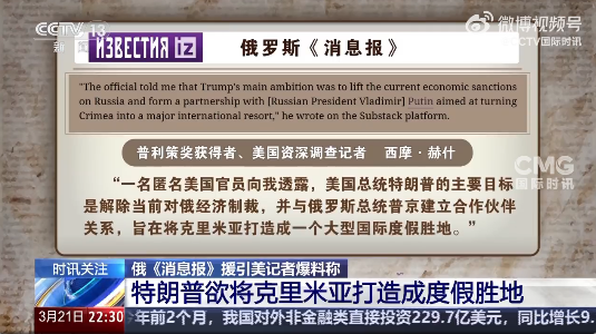 据@CCTV国际时讯消息,俄罗斯《消息报》网站3月21日报道称,普利策奖获得者、美国资深调查记者西摩·赫什发文称,一名匿名美国官员向他透露,“美国总统特朗普的主要目标是解除当前对俄罗斯的经济制裁,并与俄罗斯总统普京建立合作伙伴关系,旨在将克里米亚打造成一个大型国际度假胜地。”