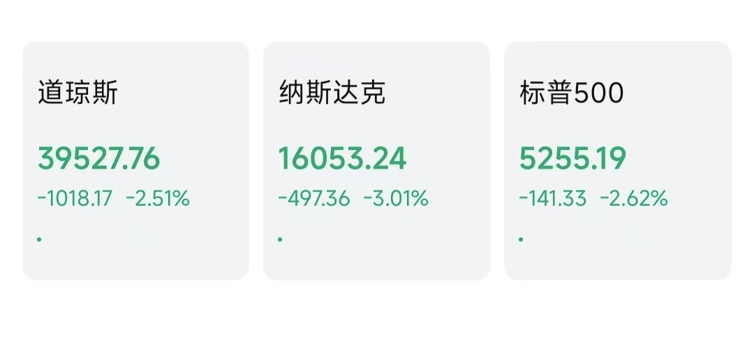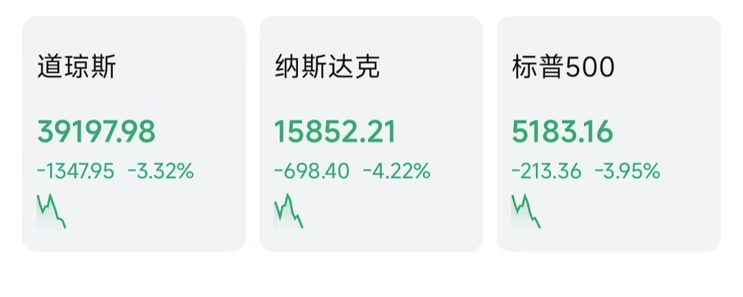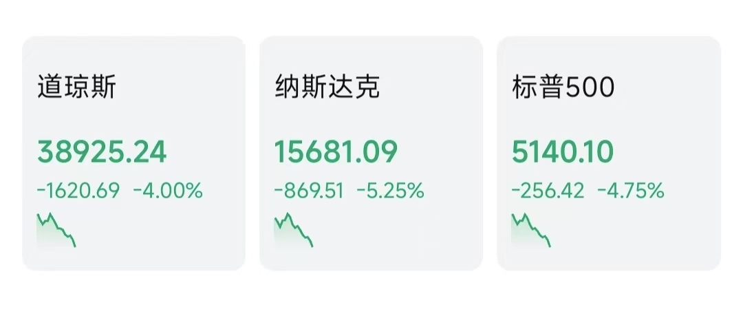 4月4日开盘,美股三大股指全线下跌。道琼斯工业指数暴跌超1000点,跌幅达2.51%;标普500指数下挫2.62%,纳斯达克综合指数暴跌3.01%。
