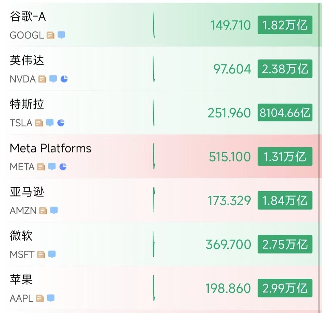 美股科技七巨头集体闪崩,特斯拉跌幅最大,跌超6%,英伟达跌超5%,Meta跌超4%,亚马逊跌超4%,微软、谷歌跌2%左右。