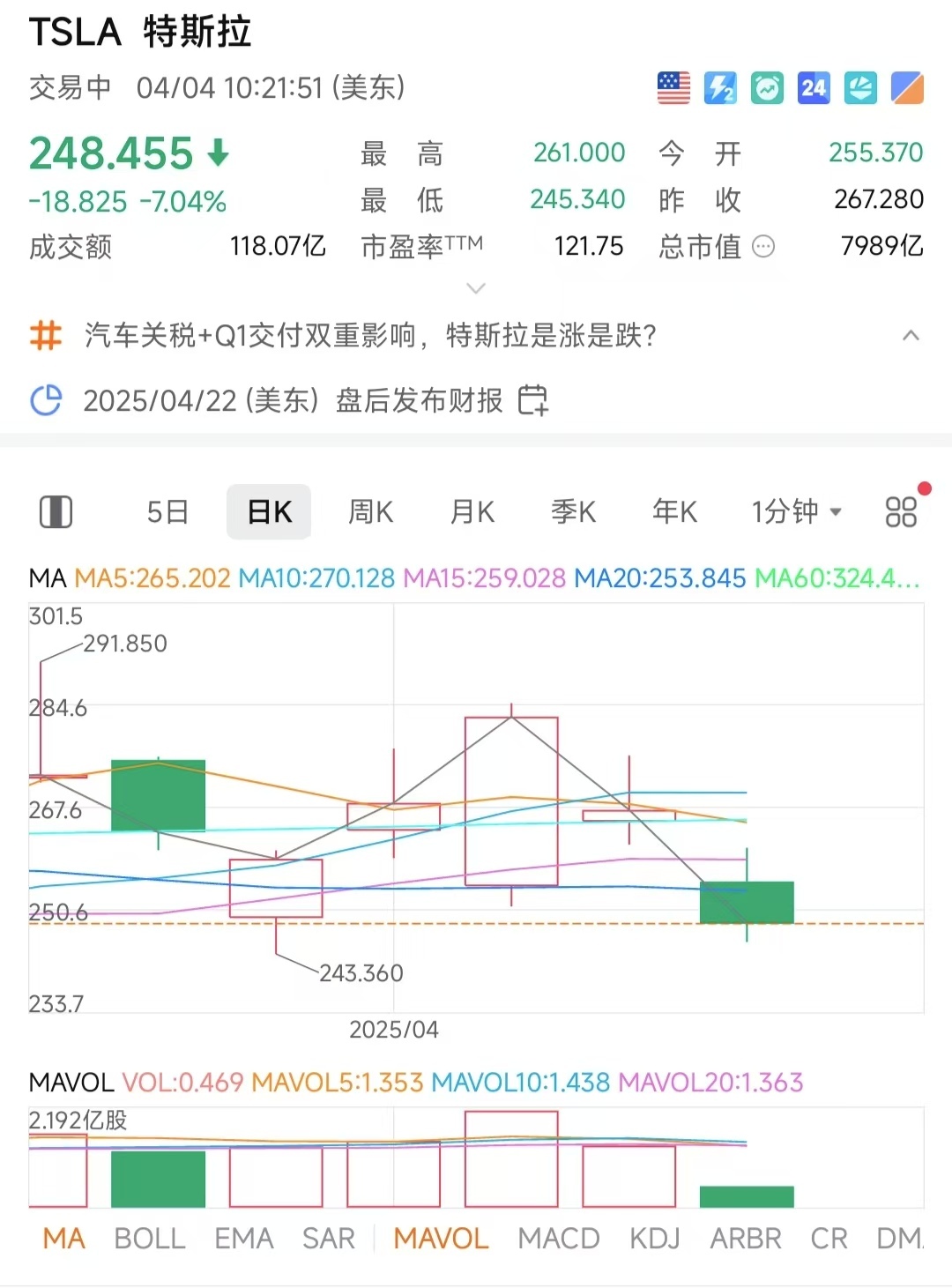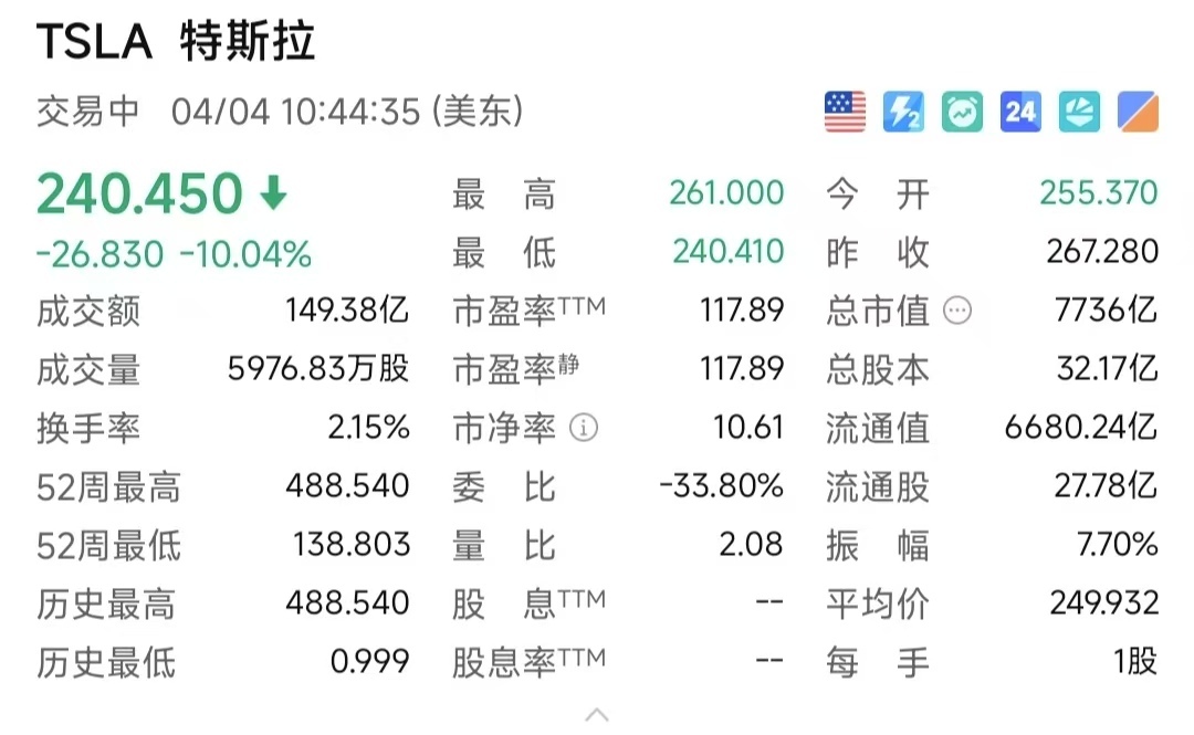 特斯拉跌破10%,股价报240.45美元/股,市值蒸发860多亿美元。