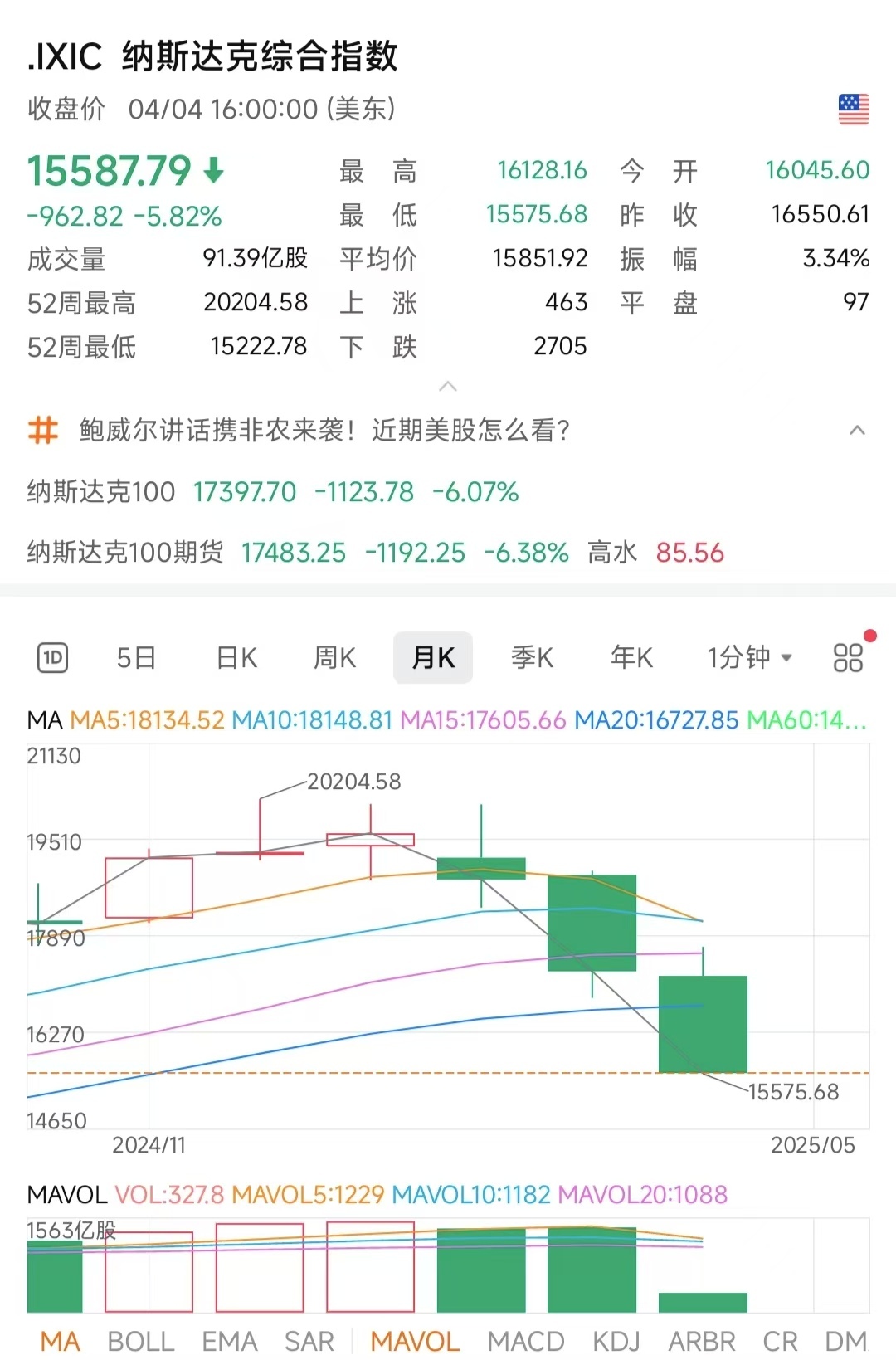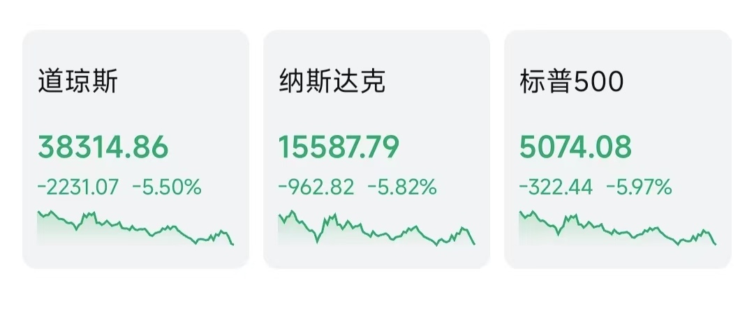 美国股市连续两天遭受重创,三大股指暴跌收盘。4月4日,道琼斯工业平均指数下跌2231.07点,跌幅为5.50%;标准普尔500种股票指数下跌322.44点,跌幅为5.97%;纳斯达克综合指数下跌962.82点,跌幅为5.82%。