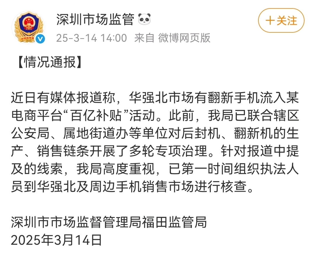 3月14日,深圳市市场监督管理局官方微博发布消息,已注意到近日媒体报道华强北市场有翻新手机流入某电商平台“百亿补贴”活动。