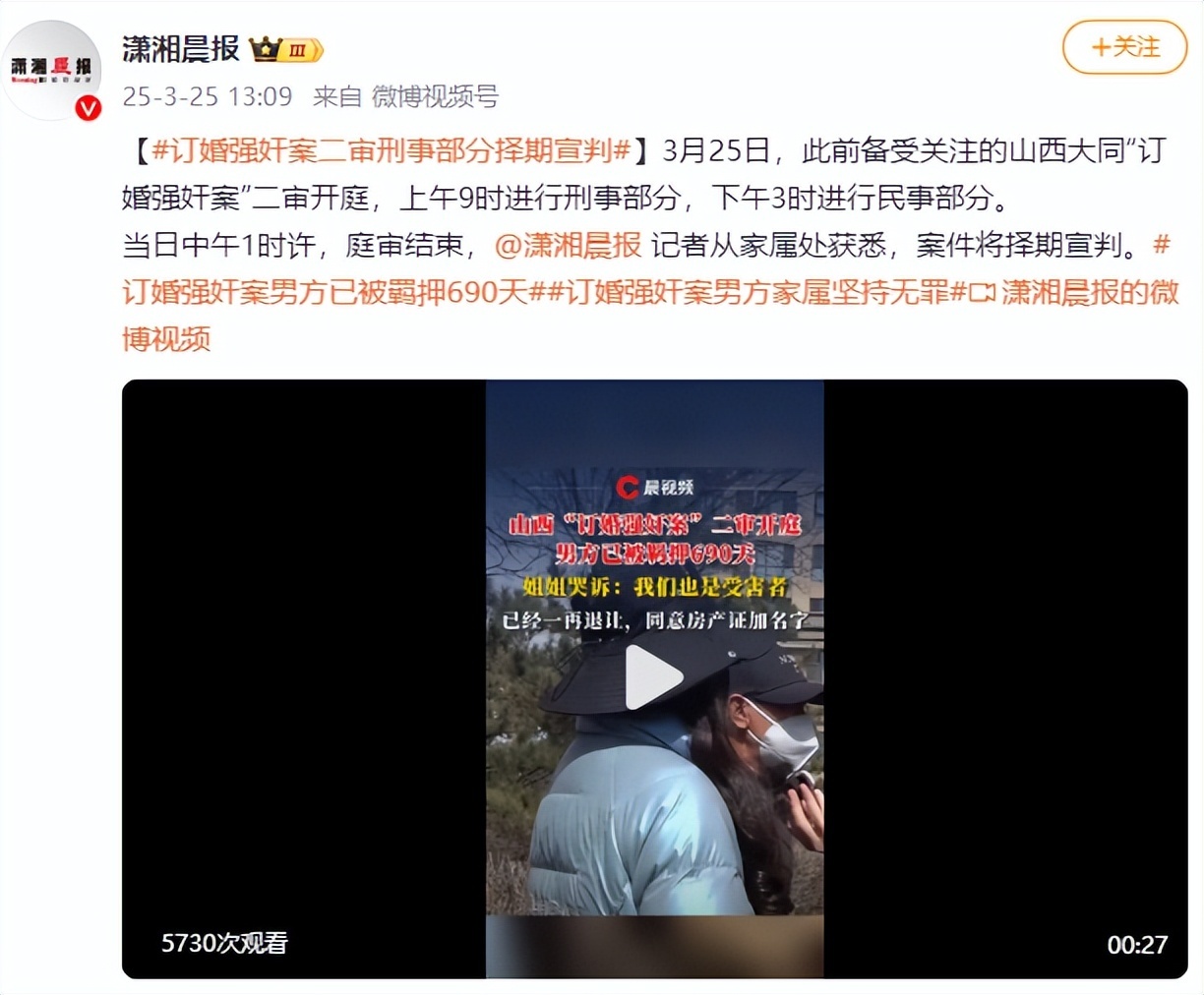 3月25日,此前备受关注的山西大同“订婚强奸案”二审开庭,上午9时进行刑事部分,下午3时进行民事部分。当日中午1时许,庭审结束,@潇湘晨报 记者从家属处获悉,案件将择期宣判。来源:@潇湘晨报 编辑 古嘉莹 订阅后可查看全文(剩余80%)