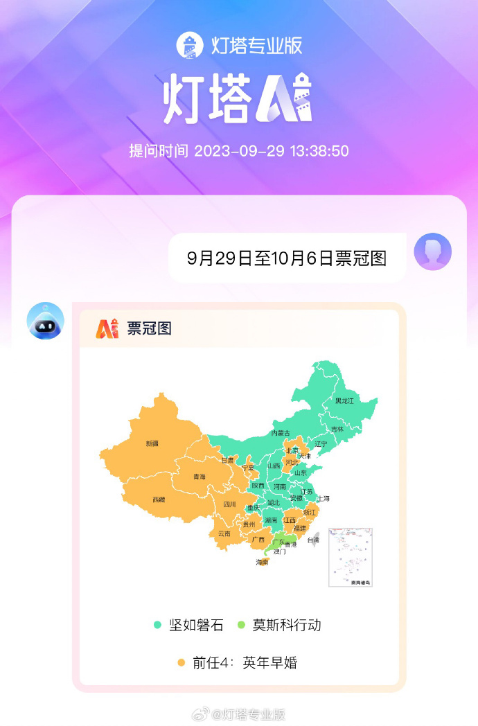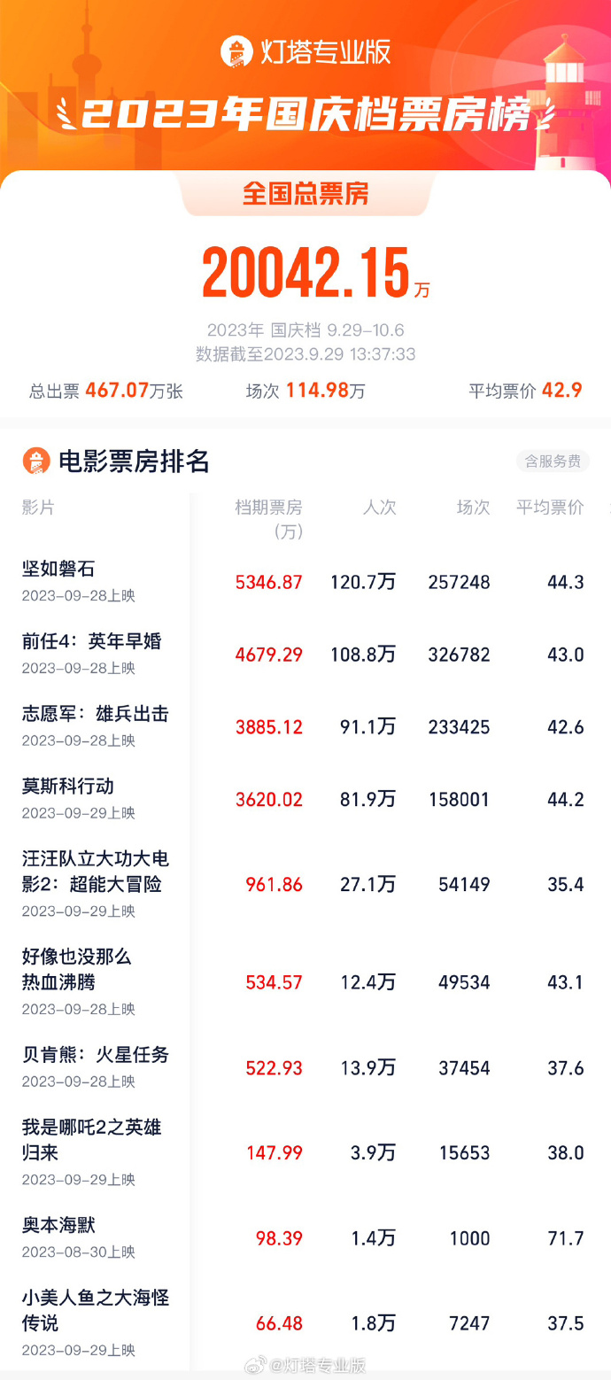 据灯塔专业版,截至9月29日13时37分,2023国庆档(9月29日-10月6日)总票房突破2亿,《坚如磐石》《前任4:英年早婚》《志愿军:雄兵出击》暂居当前档期票房前三位。 编辑 李静娴 订阅后可查看全文(剩余80%)