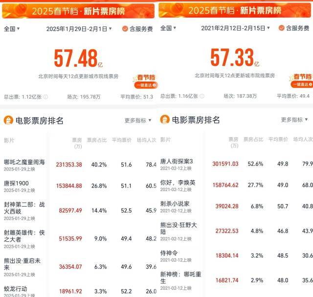 据网络平台数据,2025大年初一至大年初四累计电影票房超57.4亿,成为历史春节档同期票房新高。此外,2025年中国电影市场累计票房超北美票房成绩,位列全球第一。详情>>