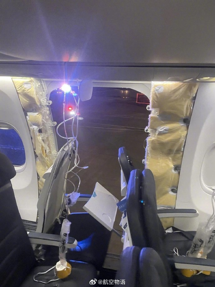 美国阿拉斯加航空一架交付于去年11月初的737 MAX 9(N704AL)执飞AS1282航班从波特兰起飞后飞行过程中一块客舱壁(左后侧安全出口门位置)直接爆炸脱落,机上多人受伤,飞机被迫紧急返航波特兰机场,全程用时20分钟。这是极其罕见也是极其危险的情况。