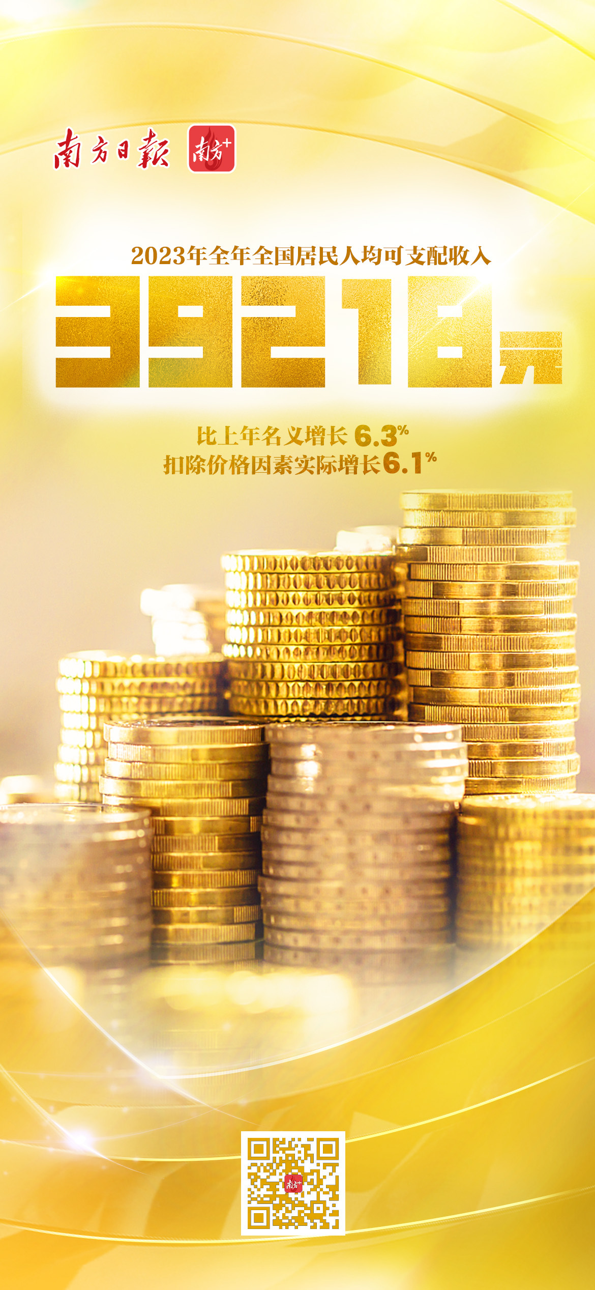 国家统计局发布,2023年全年全国居民人均可支配收入39218元,比上年名义增长6.3%,扣除价格因素实际增长6.1%。