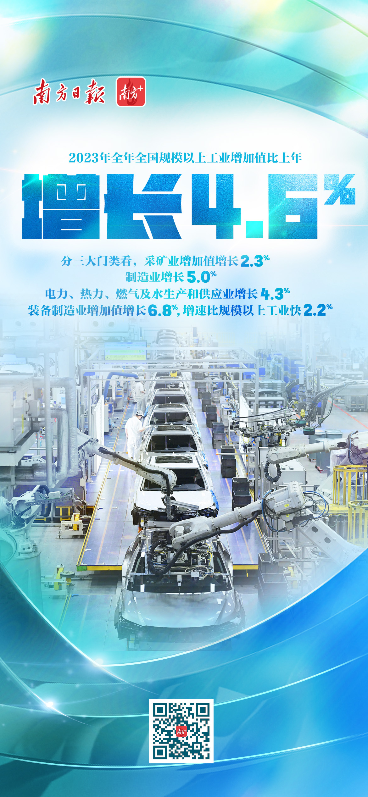 国家统计局发布,2023年全年全国规模以上工业增加值比上年增长4.6%。分三大门类看,采矿业增加值增长2.3%,制造业增长5.0%,电力、热力、燃气及水生产和供应业增长4.3%。装备制造业增加值增长6.8%,增速比规模以上工业快2.2个百分点。