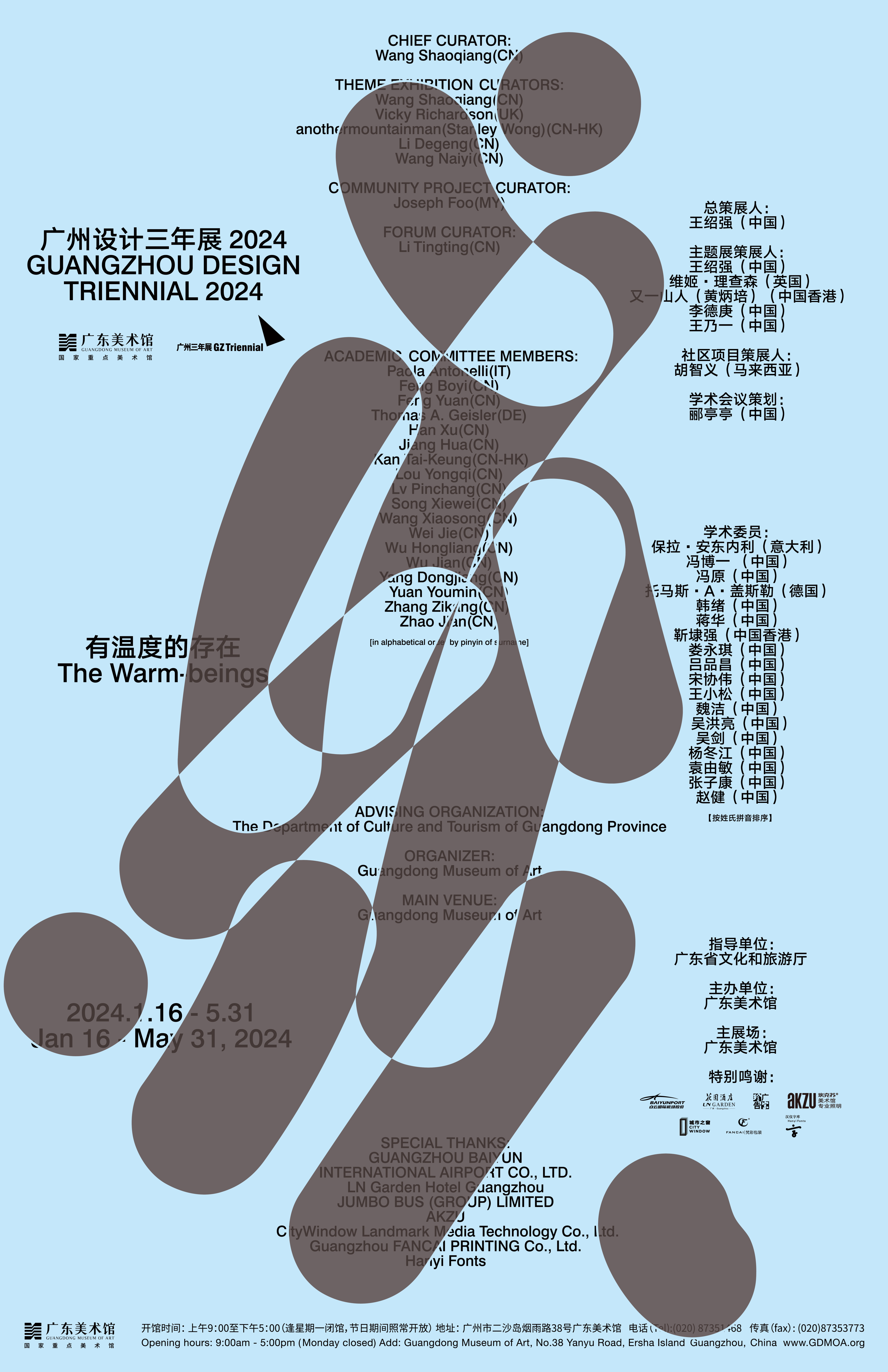 本次展览由广东省文化和旅游厅指导、广东美术馆主办,由广东美术馆馆长王绍强(中国)担任总策展人,维姬·理查森Vicky Richardson(英国)、又一山人(黄炳培)(中国香港)、李德庚(中国)、王乃一(中国)担任主题展策展人,胡智义Joseph Foo(马来西亚)担任社区项目策展人。展览将持续至5月31日。
