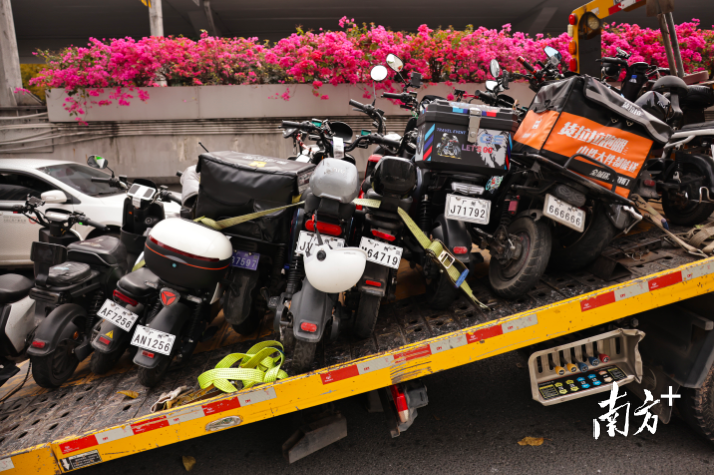 现场,多辆电动自行车被查扣,有外卖从业者的车辆、有明显改装痕迹的车辆,也有普通无牌电动自行车。据广州市公安局交通警察支队指挥中心陶警官介绍,有3类电动自行车或将被查扣。分别是:非法改装、加装且车主拒不恢复或现场无法恢复原状的车辆;电动自行车有3个及以上违法记录,且车主逾期不接受处理的车辆;无广州市登记的有效号牌,违法上路的电动自行车。