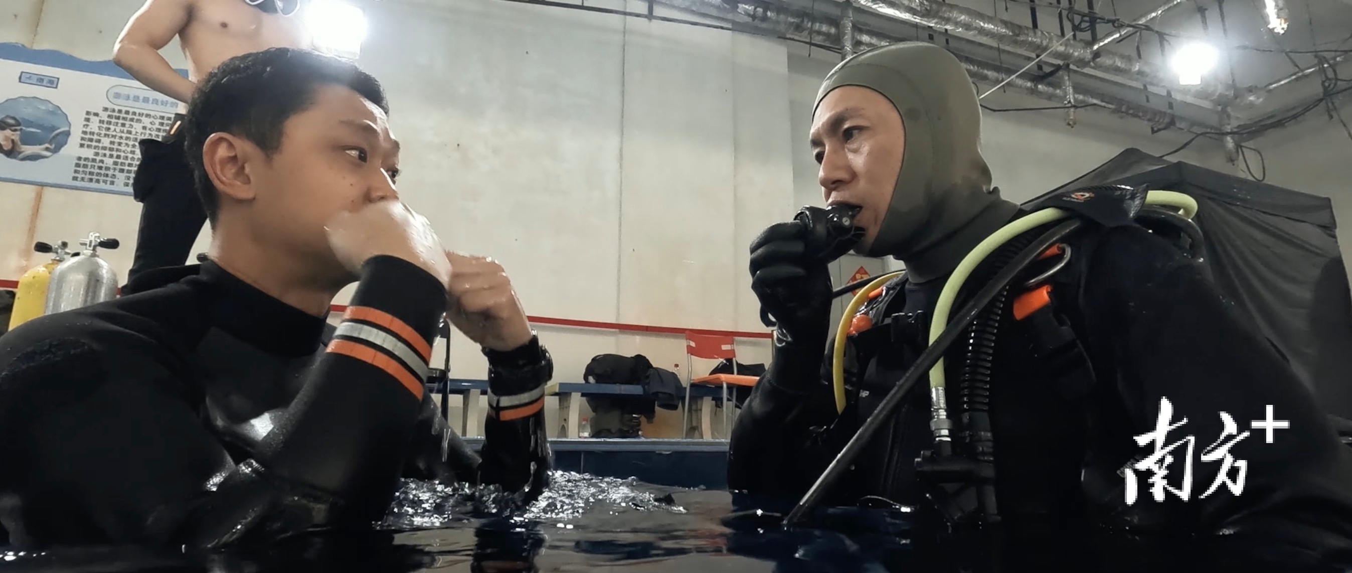 林超贤很喜欢跟着演员一起潜入水下。水温可能会极低,大家都冷得发抖。到了岸上,一起愉快地喝着热茶。