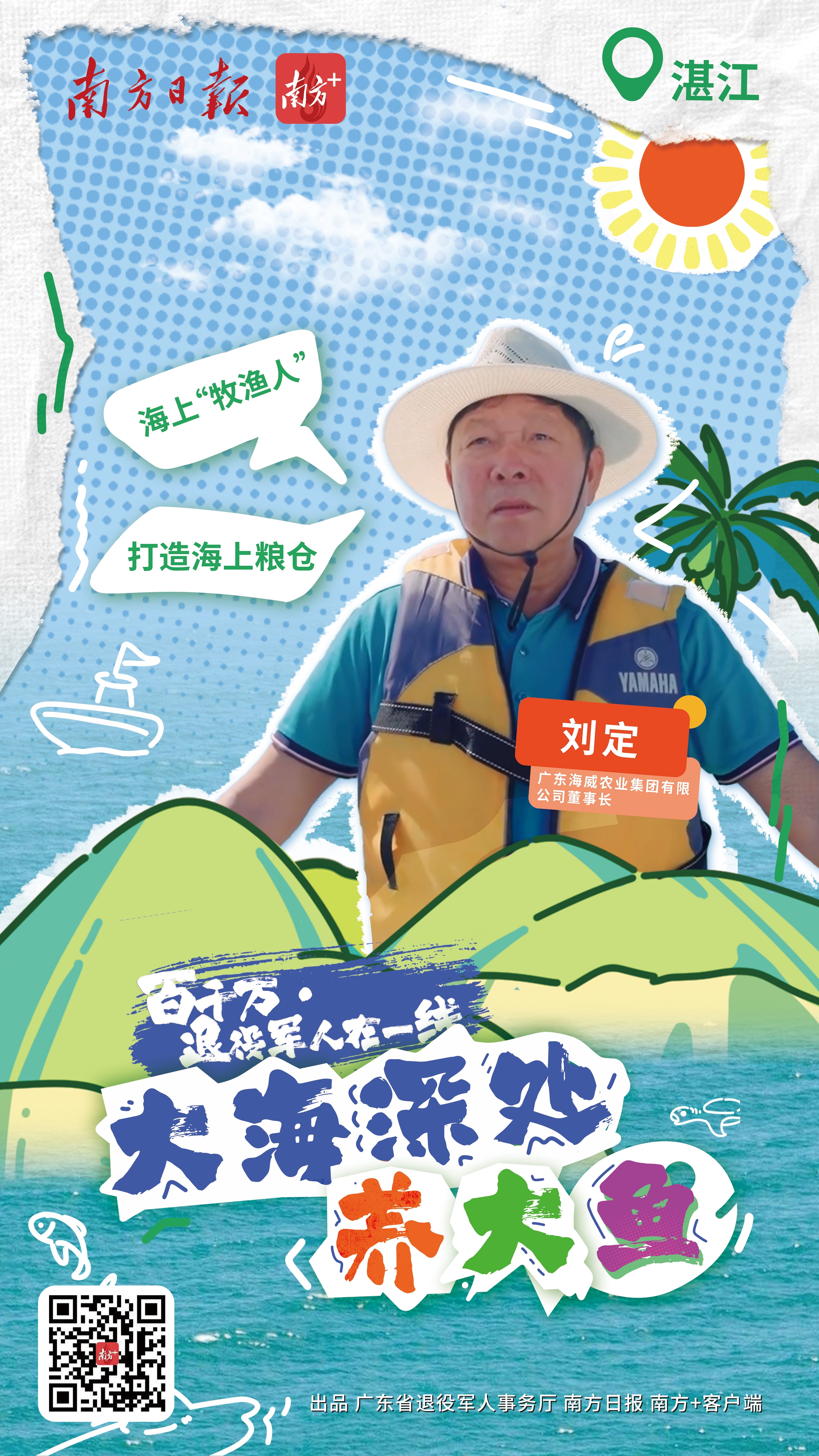 广东海威农业集团有限公司董事长刘定参军4年后,退役回到家乡开始创业,带动当地种苗生产研究和生态养殖发展,建设海洋牧场,成为湛江海洋养殖领军人物,积极参与乡村振兴工作,带领当地父老乡亲一同致富。