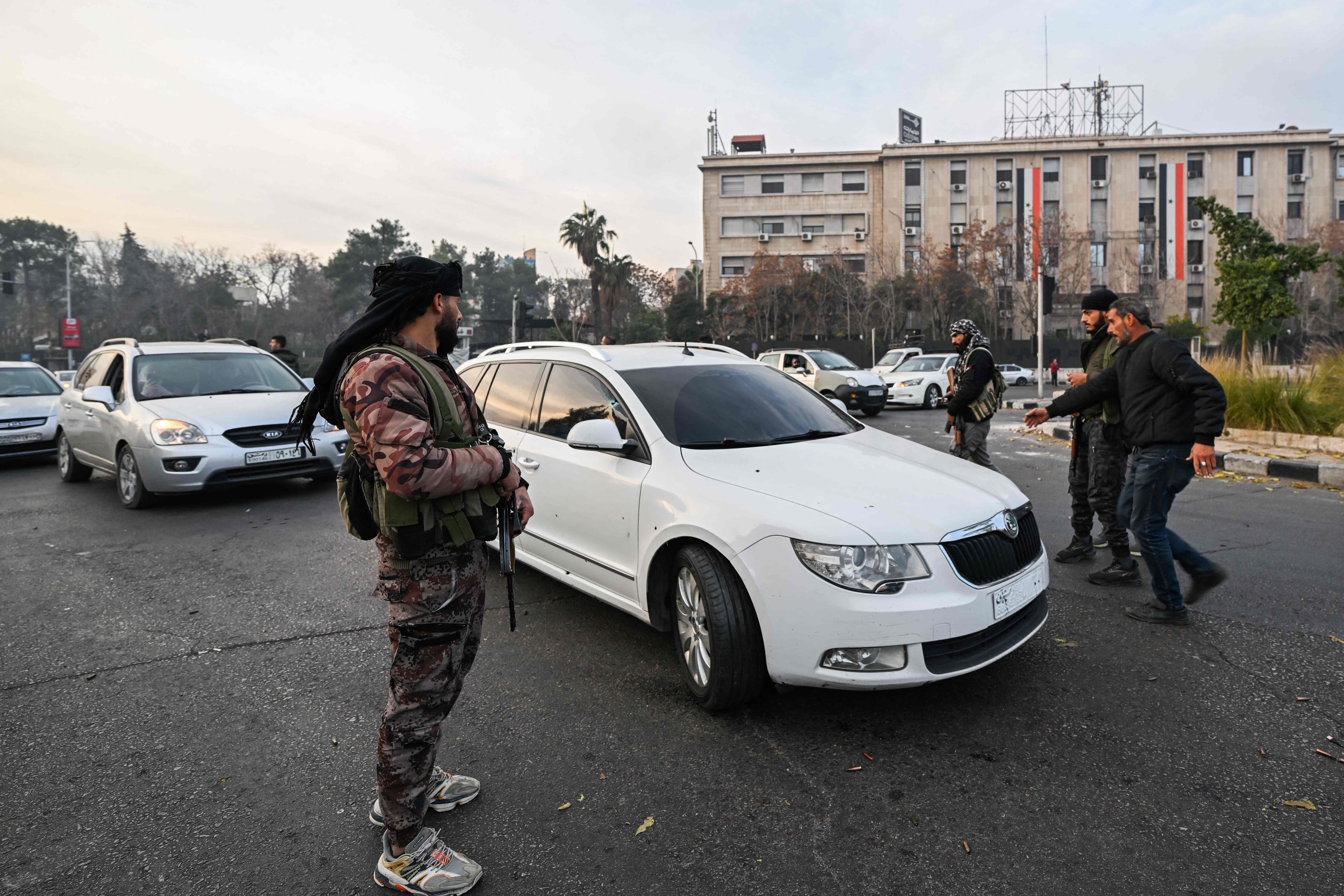 12月8日,叙利亚反对派武装在首都大马士革的道路上检查过往车辆。图源新华社