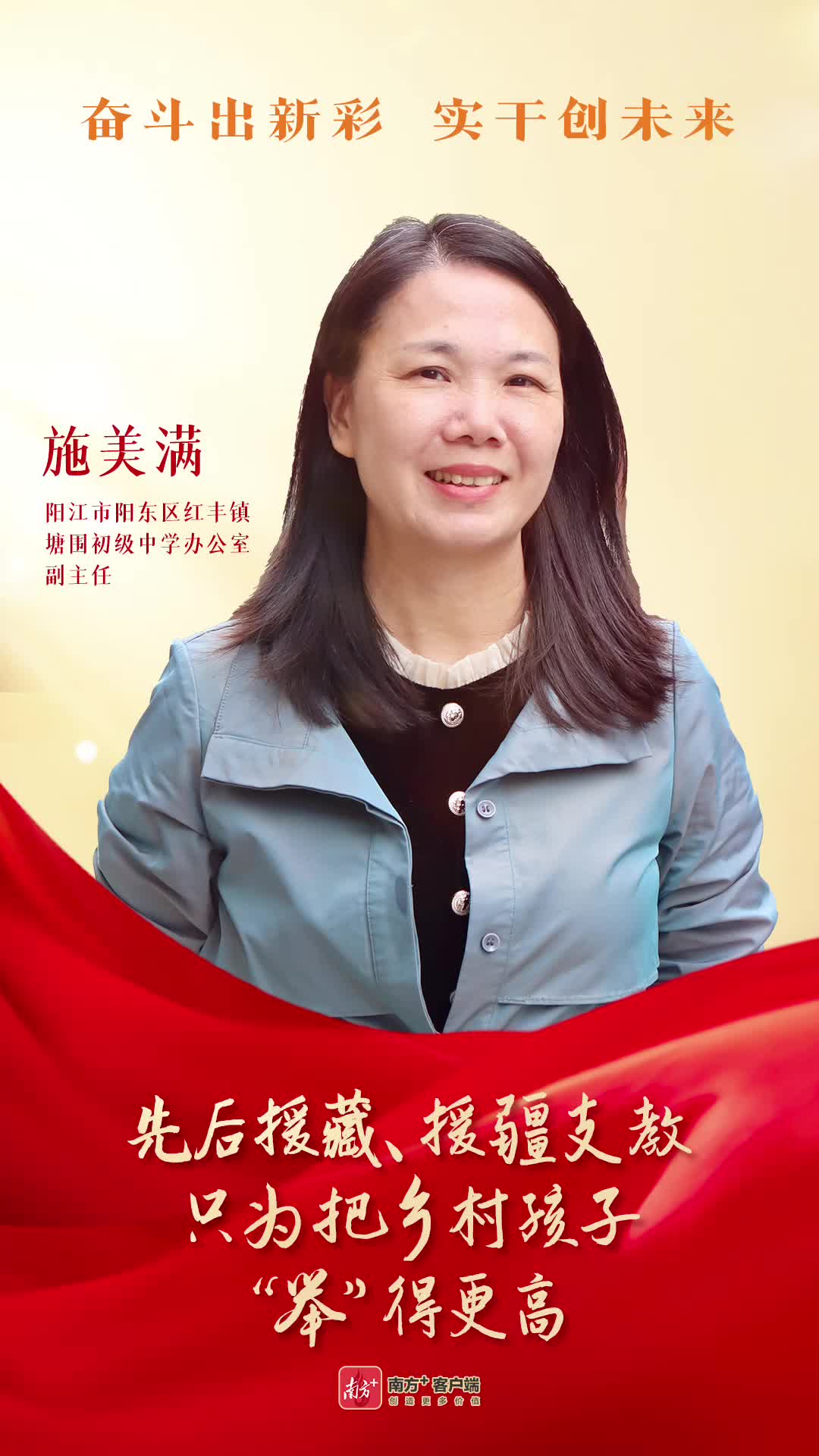但自从奔赴乡村教育一线,20多年来施美满潜心教学、细心呵护学生成长、将爱播撒到更远的边疆地区,这个“普通教师”做了许多不普通的事儿。她的努力和奉献也渐渐被更多人看到,这些年,她先后获得“南粤优秀教师”“阳江市优秀教师”以及“广东省教育援疆‘五个一工程’先进标兵”等称号,2021年还被评为“广东好人”。