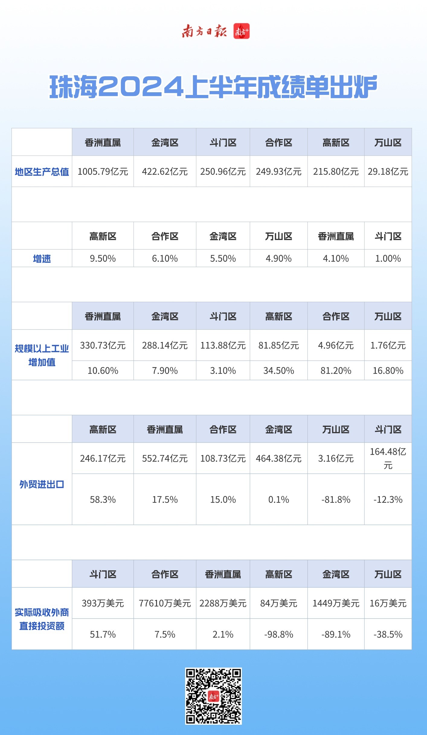 7月30日,珠海2024上半年成绩单出炉,各行政区、功能区主要经济指标也同步公布。南方+梳理了各区经济的“期中答卷”,来看不同指标下,哪个区表现最亮眼?