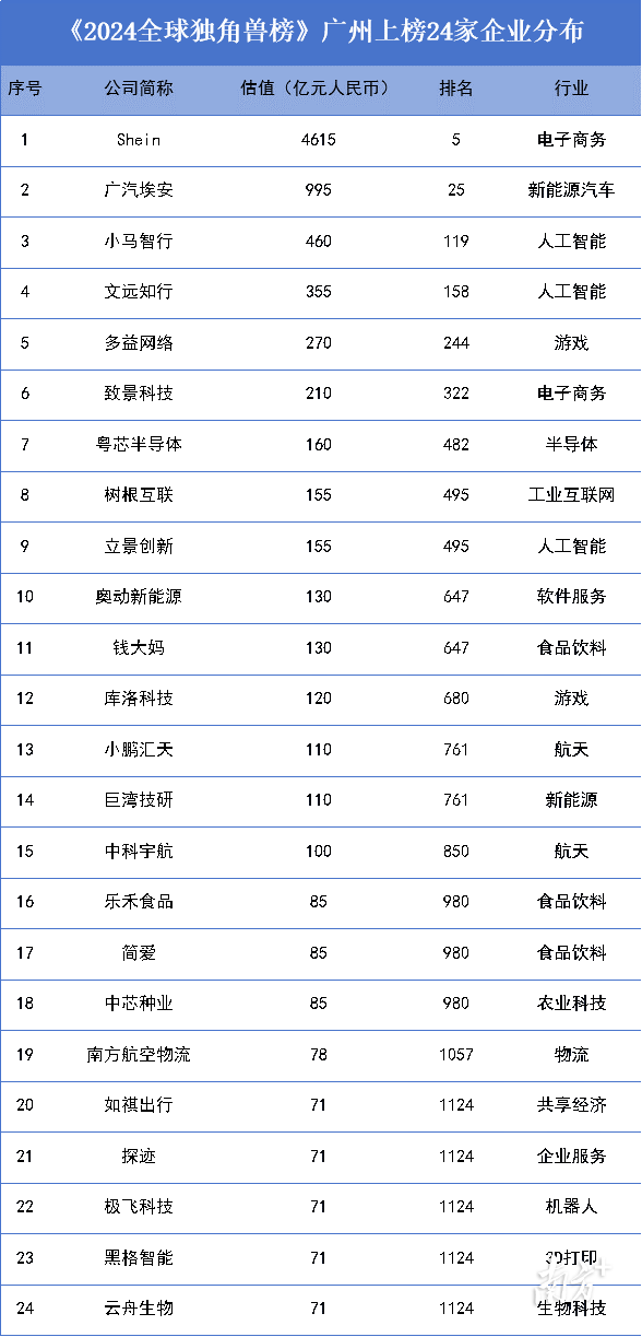 近日,胡润研究院发布《2024年全球独角兽榜》,广州市24家企业上榜,位居全球第9、全国第4,总量再创历史新高。